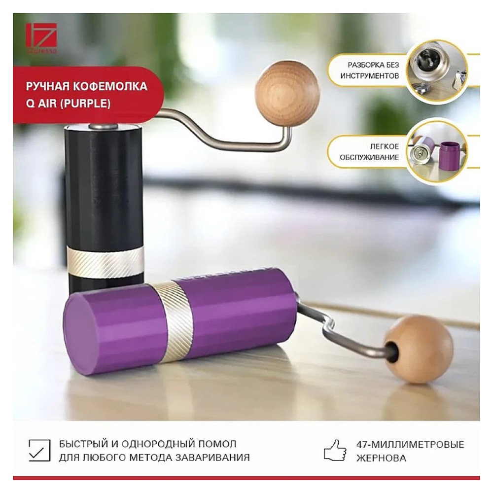 Ручная кофемолка 1Zpresso Q Air (Purple) предназначена для приготовления молотого кофе из зерен в домашних условиях. Модель оснащена удобной рукояткой. Корпус цилиндрической формы выполнен из поликарбоната с граненой поверхностью фиолетового оттенка и серебристой вставкой из нержавеющей стали, наконечник рукоятки шарообразной формы – из дерева, жернова – из нержавеющей стали.