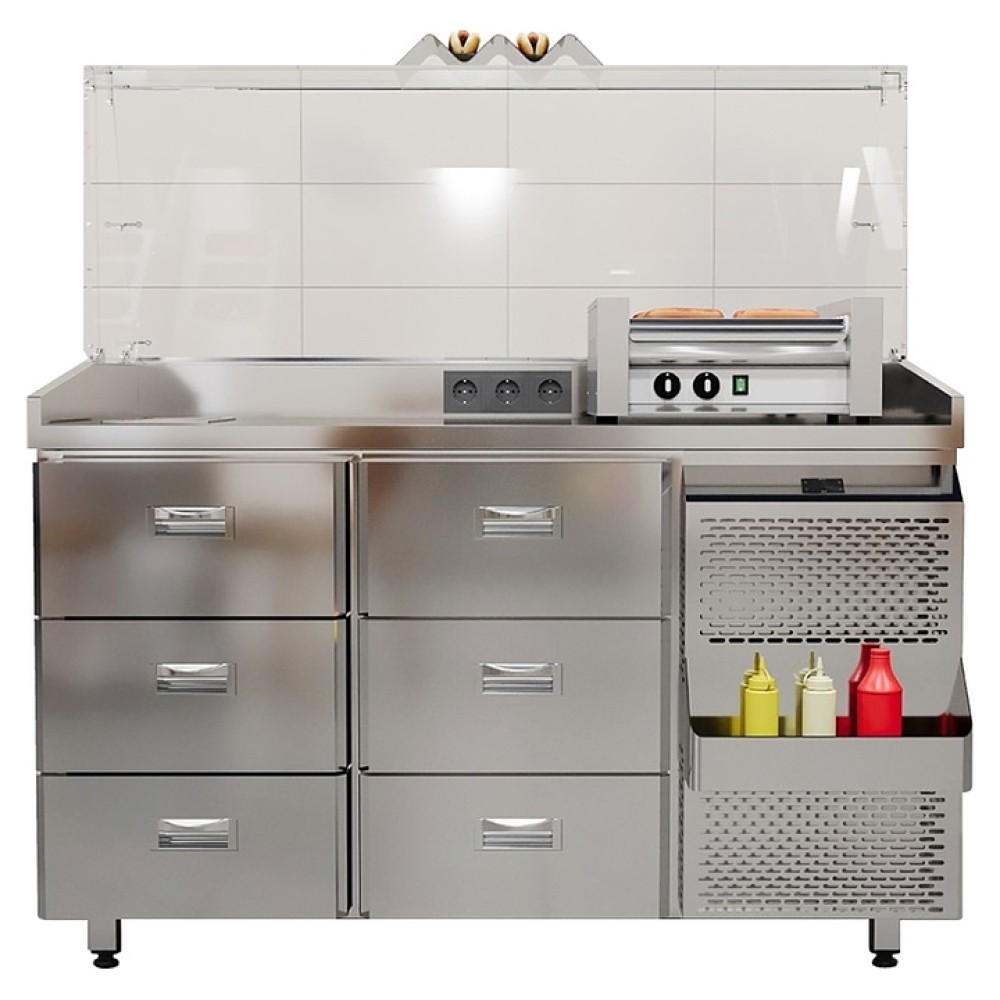 Станция Finist СХ-14-800-0/6 предназначена кратковременного хранения и обработки ингредиентов, размещения технологического оборудования для приготовления хот-догов на предприятиях общественного питания и торговли. Модель оснащена встроенным агрегатом справа, холодильной камерой с 2 секцией по 3 выдвижных ящика в каждой, столешницей повышенной прочности с охлаждаемым холдером под гастроемкости, прозрачным защитным экраном, 3 розетками, подставкой под 4 стандартные бутылки с соусами, подставкой под готовые хот-доги, устойчивыми опорами с подпятниками, кабелем питания с евровилкой и панелью управления. Корпус выполнен из высококачественной нержавеющей стали.