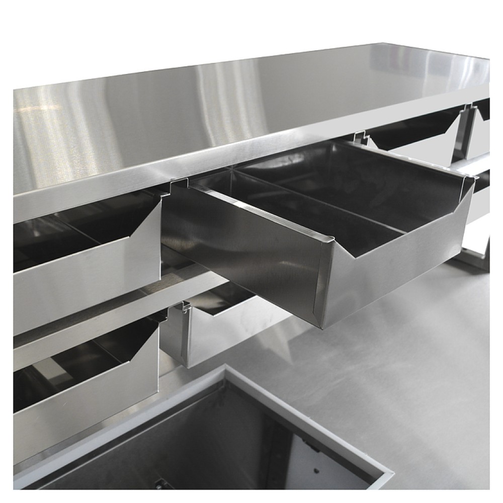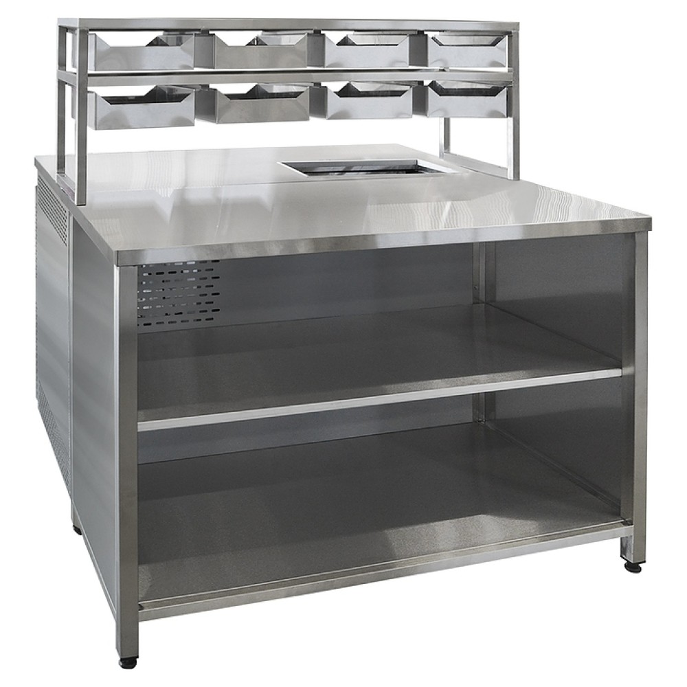 Станция Finist СПБ предназначена кратковременного хранения и обработки ингредиентов, размещения технологического оборудования и инвентаря для приготовления бургеров на предприятиях общественного питания и торговли. Модель оснащена холодильным столом с встроенным агрегатом с боковым расположением, холодильной камерой с распашными дверьми, столешницей повышенной прочности с охлаждаемым вырезом под гастроемкости, нейтральной тумбой без дверей для сбора готовой продукции, надстройкой с 4 секциями с выдвижными лотками для хранения упаковки и принадлежностей, устойчивыми опорами с подпятниками, кабелем питания с евровилкой и панелью управления. Корпус выполнен из высококачественной нержавеющей стали.
