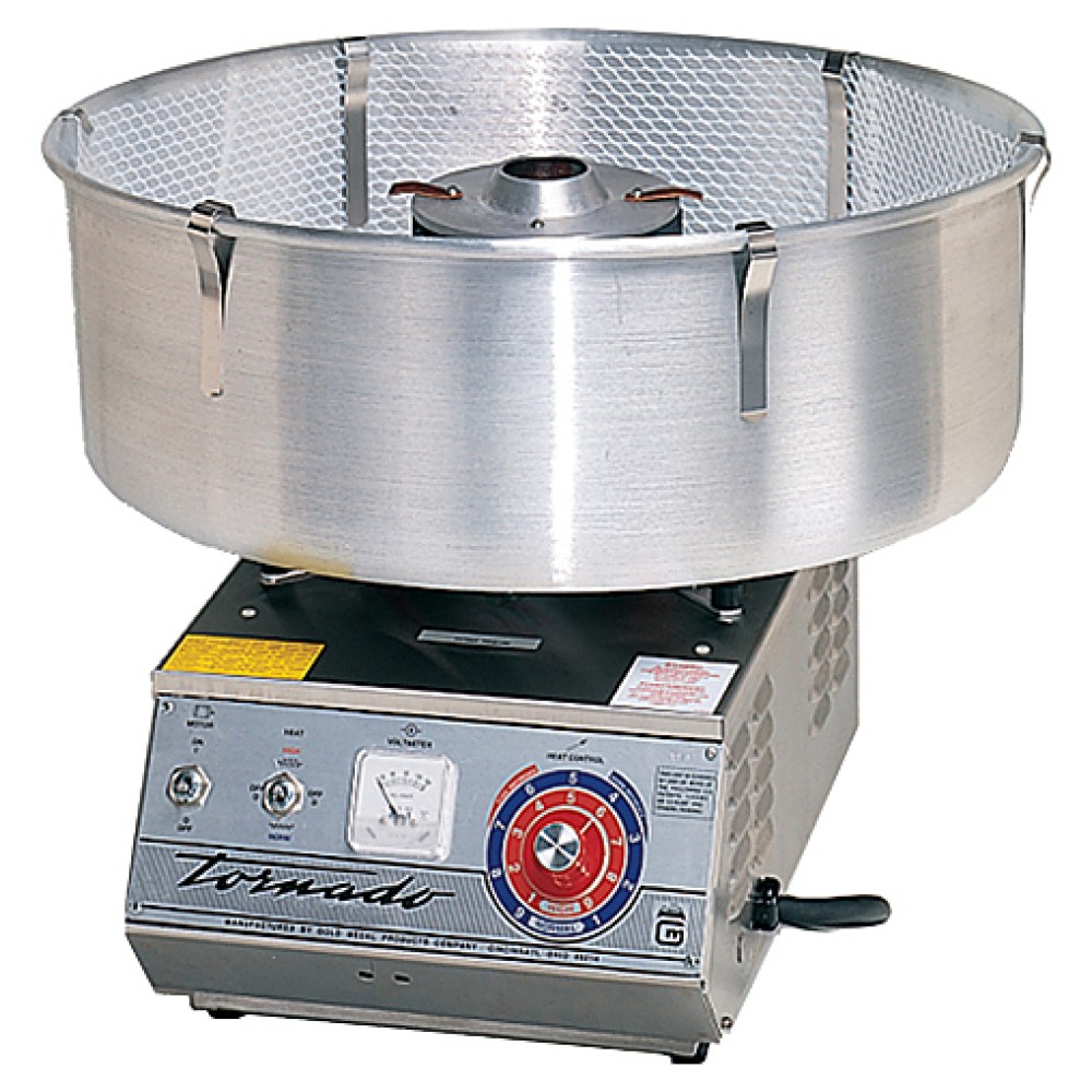 Аппарат для сахарной ваты Gold Medal Tornado используется в уличных кафе, кинотеатрах и развлекательных центрах. Оборудование оснащено нагревательной спиралью. Корпус выполнен из нержавеющей стали, ловитель - из алюминия.