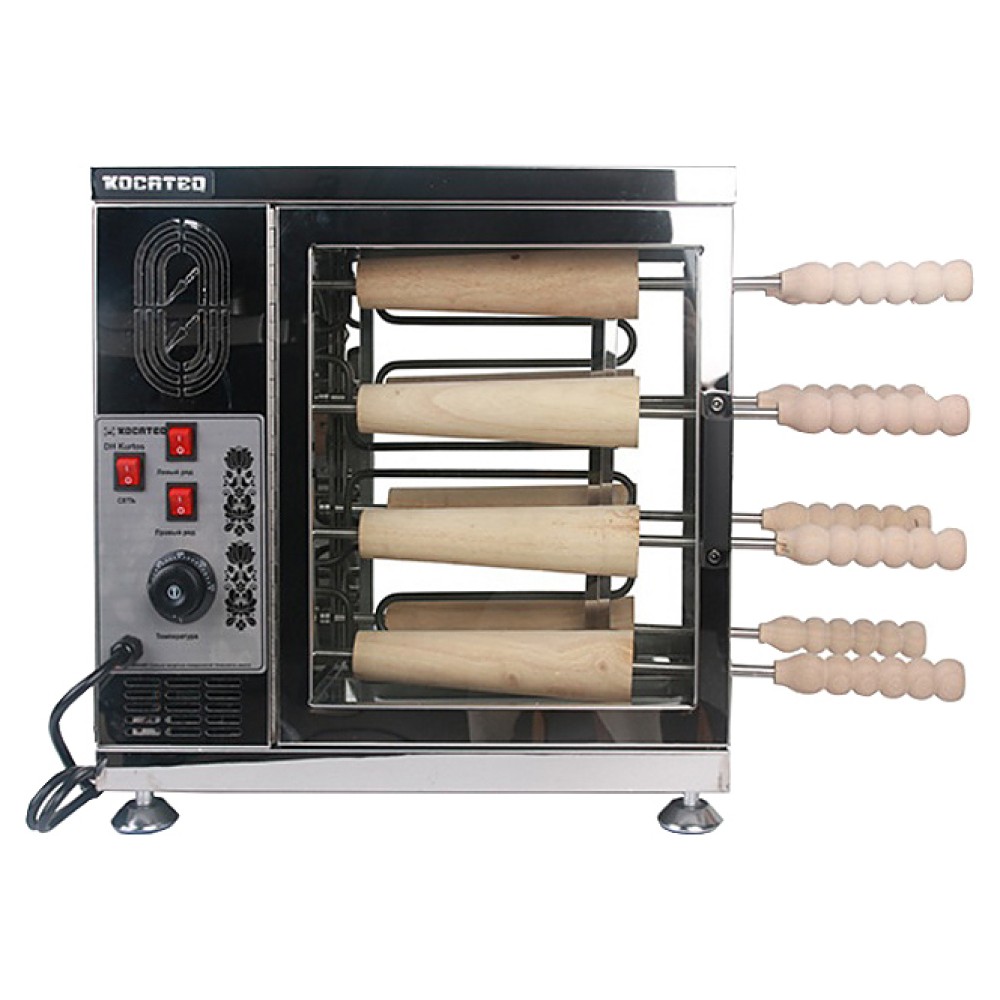 Настольная печь для трдельников Kocateq DHKurtos NW используется на предприятиях общественного питания и торговли, в пекарнях и кондитерских для выпечки до 8 венгерских калачей. Сдобное тесто раскатывается в тонкий жгут, наматывается на валки и запекается. Модель оснащена панелью управления и термостатом для автоматического поддержания температуры. Корпус выполнен из нержавеющей стали AISI 201, ножки - из металла, с пятками - из пластика.