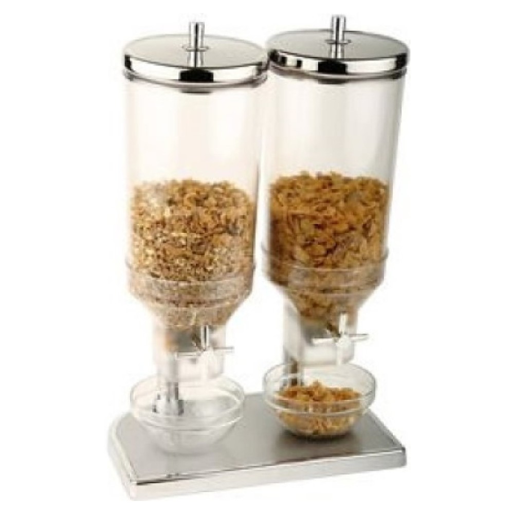 Диспенсер APS 11807 используется на предприятиях общественного питания и торговли для порционной раздачи сыпучих продуктов, таких как мюсли или кукурузные хлопья. Модель оснащена 2 съемными контейнерами. Корпус выполнен из нержавеющей стали, емкости - из поликарбоната.