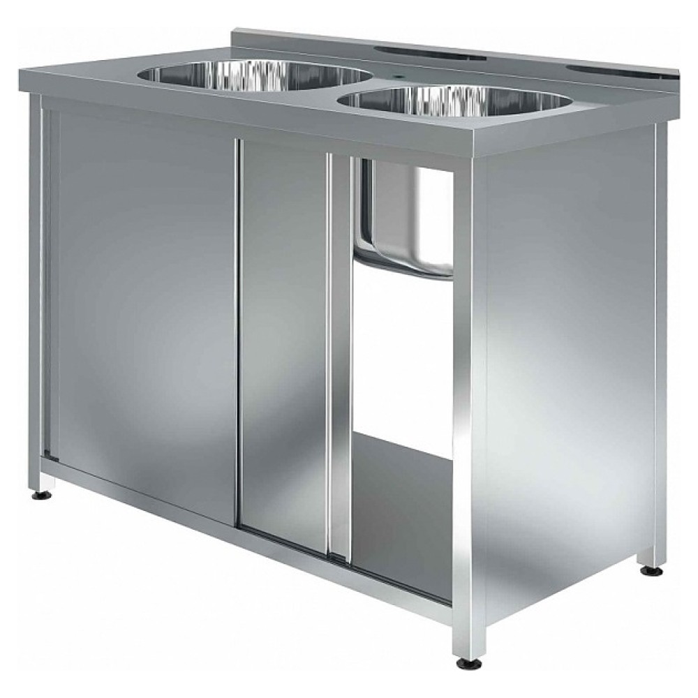 Моечная ванна Assum СПКБ-10/6-2В4 серии Премиум предназначена для мытья кухонного инвентаря на предприятиях общественного питания. Модель оснащена 2 раковинами, бортом, дверями-купе, боковыми стенками, отверстием под смеситель и выпуском. Цельнотянутые раковины выполнены из высококачественной нержавеющей стали AISI 304, столешница – из нержавеющей стали AISI 430 с усилением из ламинированной древесно-стружечной плиты, боковые стенки, двери и полка – из нержавеющей стали AISI 430, сварной каркас – из профиля трубы квадратного сечения (опоры) и углового профиля из нержавеющей стали AISI 430, подпятники опор – из прочного пластика.