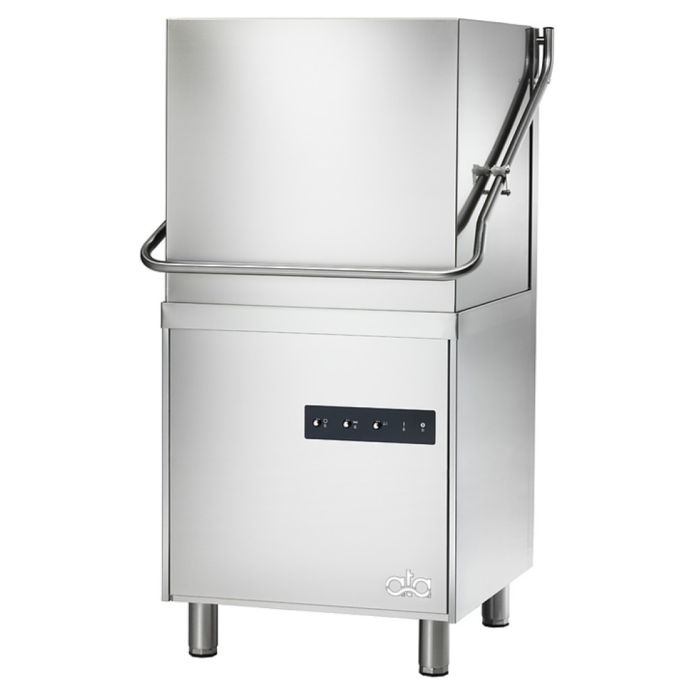Посудомоечная машина ATA B 51 предназначена для мытья в кассетах тарелок, чашек и столовых приборов с применением жидких моющих и ополаскивающих средств на предприятиях общественного питания и торговли. Модель оснащена вертикальным подъемным куполом, кабелем питания с вилкой и электромеханической панелью управления. Корпус, дверь, внутренняя облицовка камеры, рукоятка, опоры, моечные рукава, нагревательные элементы и ыпускной фильтр выполнены из высококачественной нержавеющей стали AISI 304, рукоятка, панель управления – из полимера черного цвета, кнопки с хромированным покрытием.
