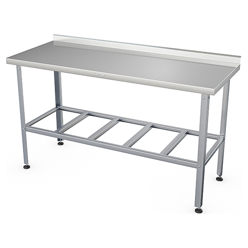 Производственный стол ATESY СР-С-1-1400.800-02-Н серии Стандарт используется на предприятиях общественного питания и торговли для разделывания и обработки пищевых продуктов, а также в качестве вспомогательной поверхности для кухонного оборудования. Модель оснащена бортом. Каркаc, полка-решетка и столешница выполнены из нержавеющей стали AISI 430. Столешница укреплена листом ламинированной древесностружечной плиты с внутренней стороны.