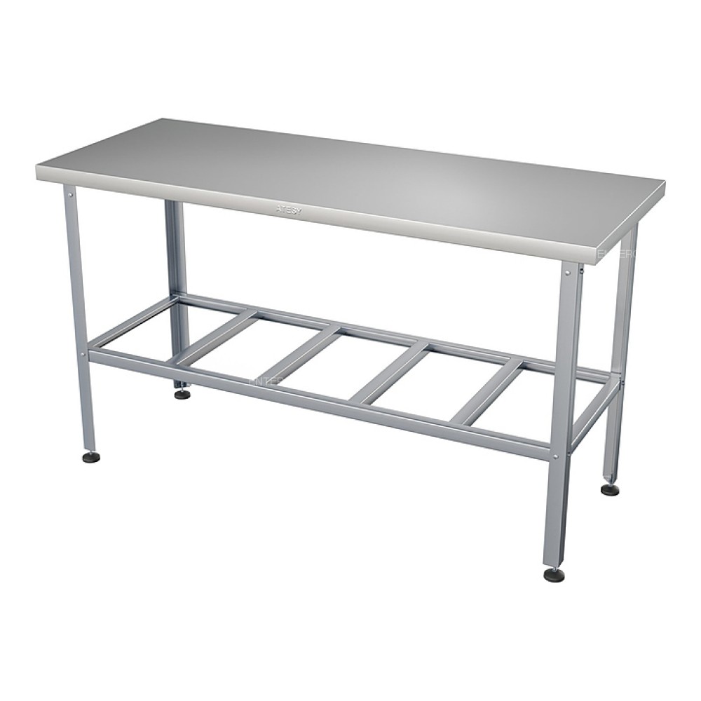 Производственный стол ATESY СР-С-1000.700-02 серии Стандарт используется на предприятиях общественного питания и торговли для разделывания и обработки пищевых продуктов, а также в качестве вспомогательной поверхности для кухонного оборудования. Каркас и полка-решетка выполнены из оцинкованной стали, столешница - из нержавеющей стали AISI 430 и укреплена листом ламинированной древесностружечной плиты с внутренней стороны.