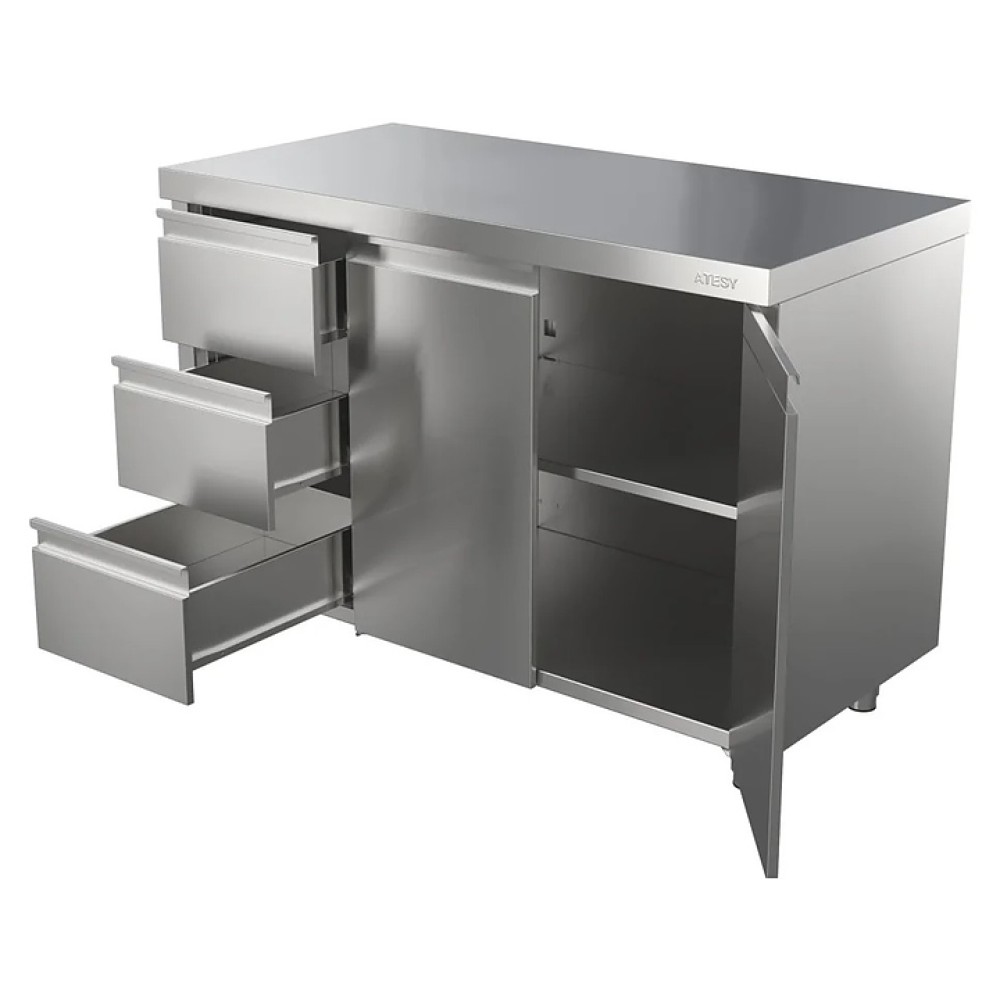 Производственный стол ATESY СТ-С-1300.600-02-Р-3Л используется на предприятиях общественного питания и торговли для разделывания и обработки пищевых продуктов, а также в качестве вспомогательной поверхности для кухонного оборудования и места хранения кухонной посуды, инвентаря и сухих продуктов. Модель оснащена 1 полкой, 3 выдвижными ящиками и 2 распашными дверцами. Столешница, двери и боковые панели выполнены из нержавеющей стали AISI 430, дно и задняя стенка - из оцинкованной стали, ножки - из нержавеющей стали с пластиковой опорной частью, столешница укреплена с внутренней стороны листом ламинированной древесно-стружечной плиты.