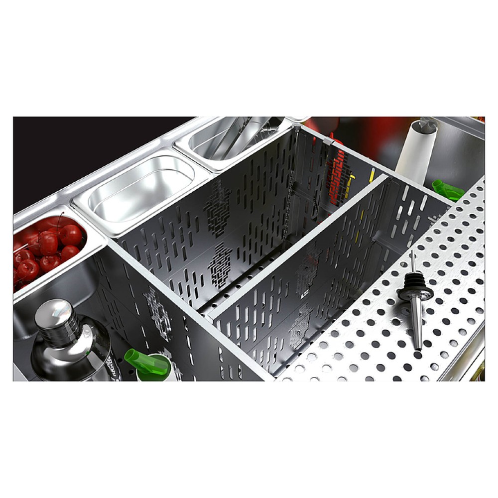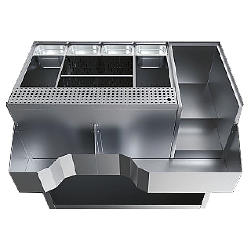 Барный модуль БАР-РУС БР-Б/99 Ледовая крепость входит в состав барного комплекса "Ансамбль" и предназначен для расположения нескольких видов льда, коктейльных ингредиентов, наполнителей и напитков на предприятиях общественного питания и торговли. Модель состоит из основания, ликерной лестницы, барной ванны для льда и кармана для бутылок. Основание и столешница изготовлены из нежавеющей стали AISI 304, гастроемкости - из нержавеющей стали AISI 201, спил-стоп - из нержавеющей стали AISI 430.