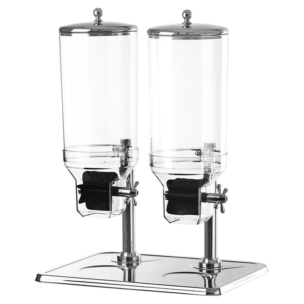 Диспенсер для мюсли MVQ AT90133-2 используется на предприятиях общественного питания и торговли для порционной раздачи мюсли, хлопьев и других сыпучих продуктов. Корпус и крышки выполнены из нержавеющей стали, емкости - из пластика.