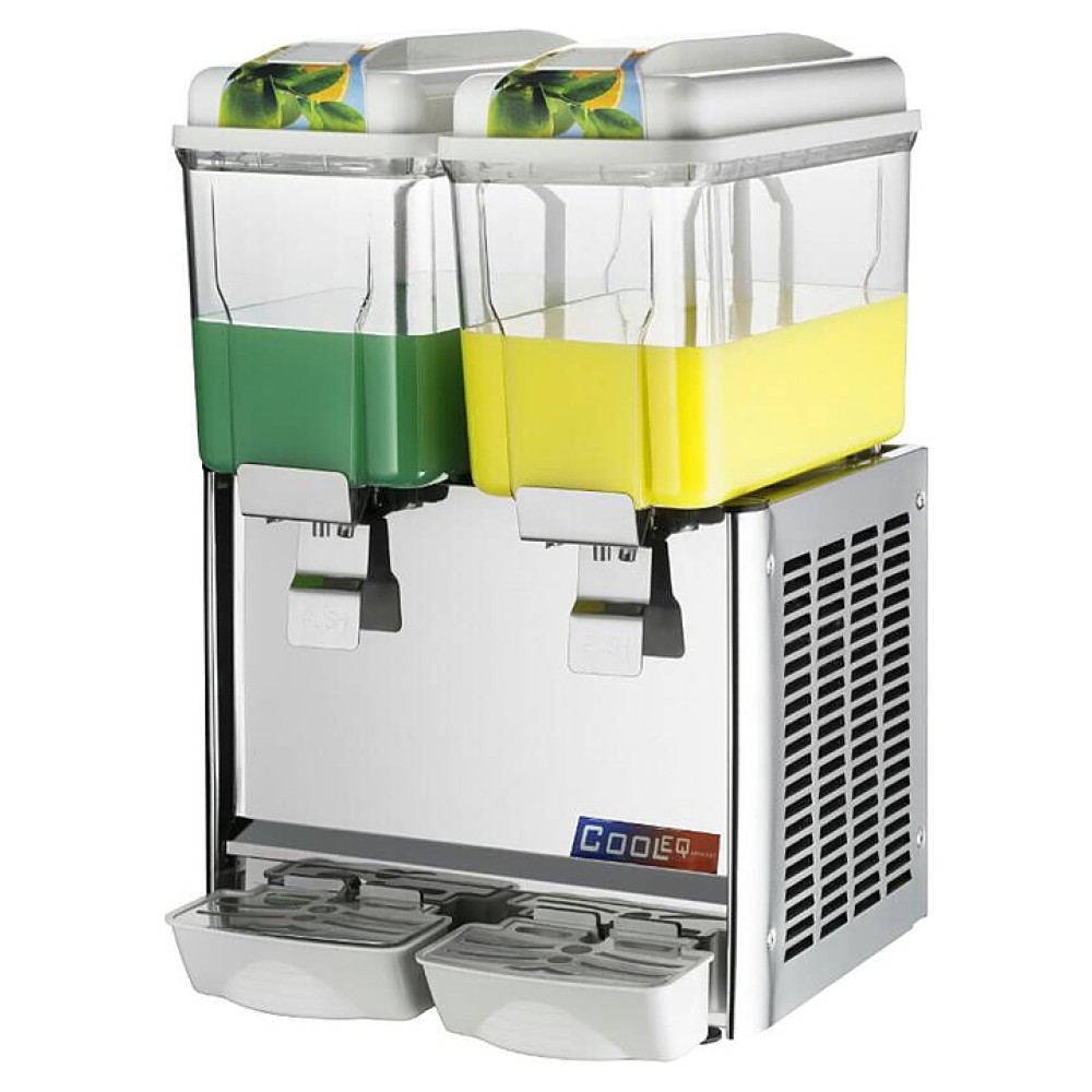 Сокоохладитель Cooleq JD-12+12 предназначен для хранения в охлажденном состоянии и последующей раздачи чая, соков, кофе и прохладительных напитков на предприятиях общественного питания и торговли. Модель оснащена лопастной системой перемешивания, которая гарантирует однородность консистенции и температуры продукта, а кран - бесперебойную подачу содержимого сокоохладителя. Корпус выполнен из нержавеющей стали, бункер - из прочного поликарбоната.