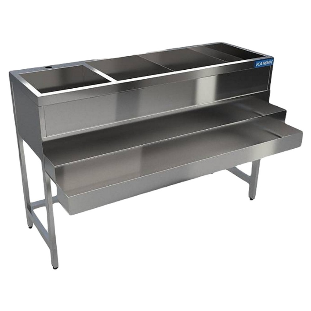Барная станция КАМИК 1000х480(600)х900 мм предназначена для комплектации барных стоек на предприятиях общественного питания и торговли. Модель оснащена сварной теплоизолированной ванной с 3 съемными перегородками и 3 перфорированными вставками. Корпус изготовлен из высококачественной пищевой нержавеющей стали AISI 430 толщиной 1 мм и профиля 20х40 и 40х40 мм, столешница, ванна, перегородки - из стали AISI 304 толщиной 1,5 мм.