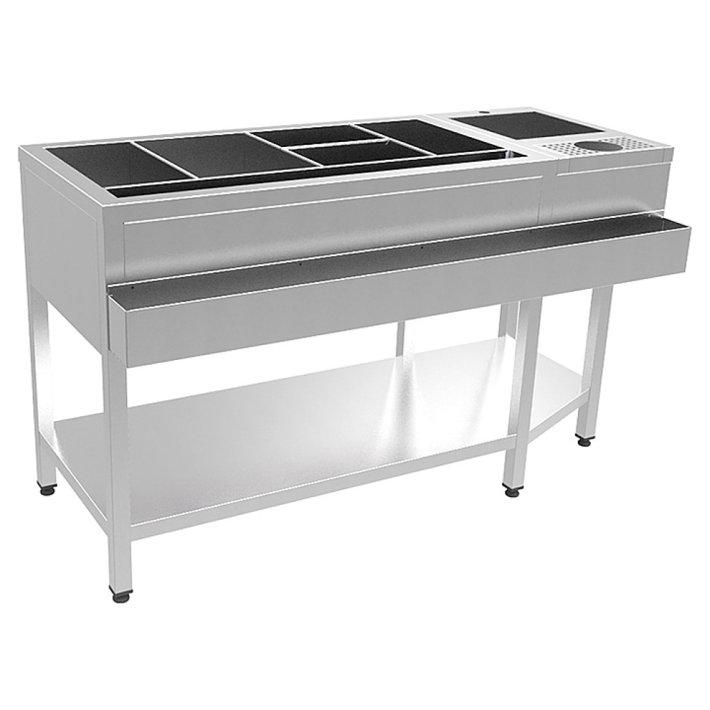 Барная станция Кобор СБ-150/68 предназначена для оборудования барных стоек, их продуктивного функционирования и оптимизации работы сотрудников на предприятиях общественного питания и торговли. Модель оснащена полкой и регулируемыми по высоте опорами ножек. Каркас выполнен из нержавеющей стальной квадратной трубы 40х40 мм, сварные раковины - из нержавеющей стали AISI 430.