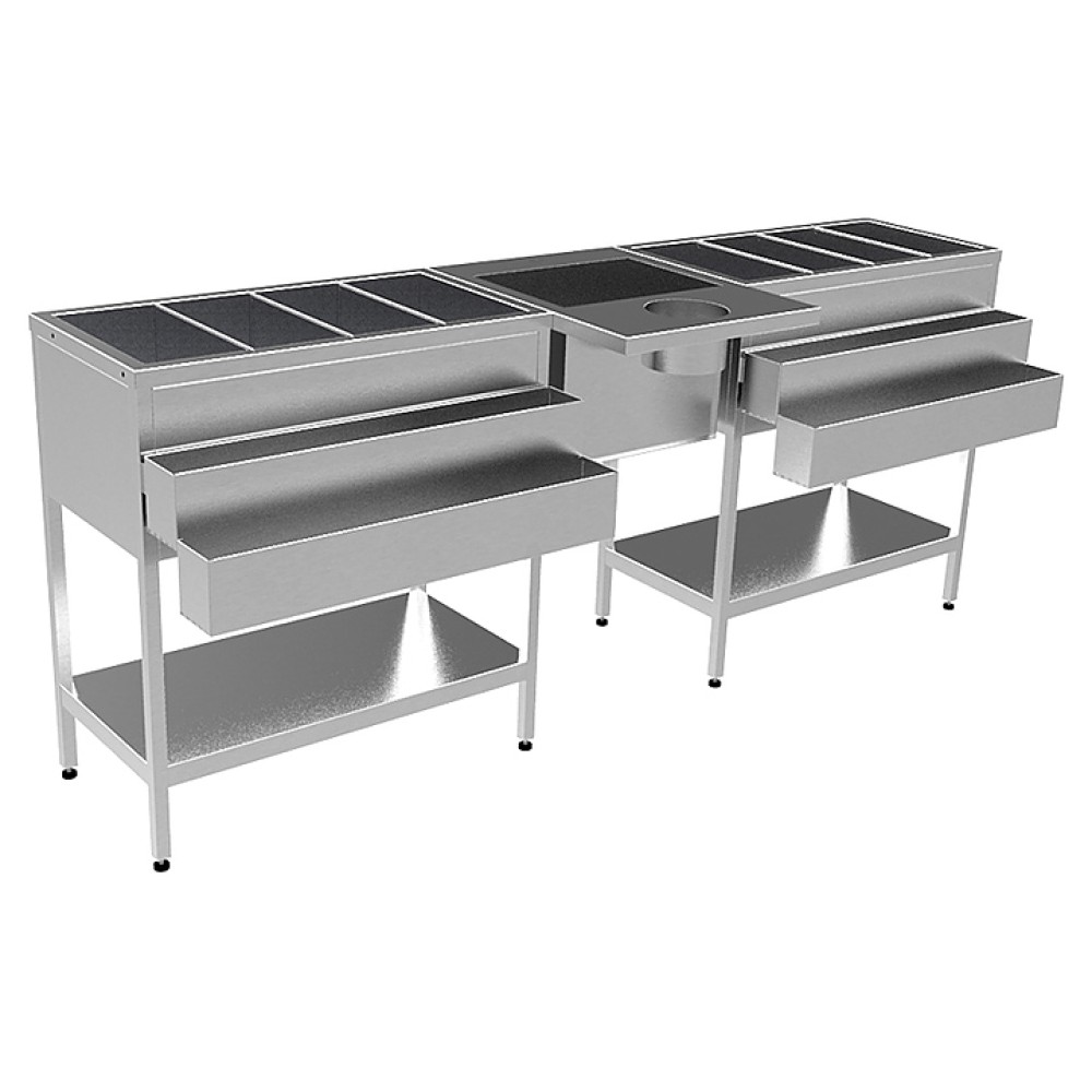 Барная станция Кобор СБ-200/60 предназначена для оборудования барных стоек, их продуктивного функционирования и оптимизации работы сотрудников на предприятиях общественного питания и торговли. Модель оснащена 2 полками и регулируемыми по высоте опорами ножек. Каркас выполнен из нержавеющей стальной квадратной трубы 25х25 мм, сварные раковины - из нержавеющей стали AISI 430.