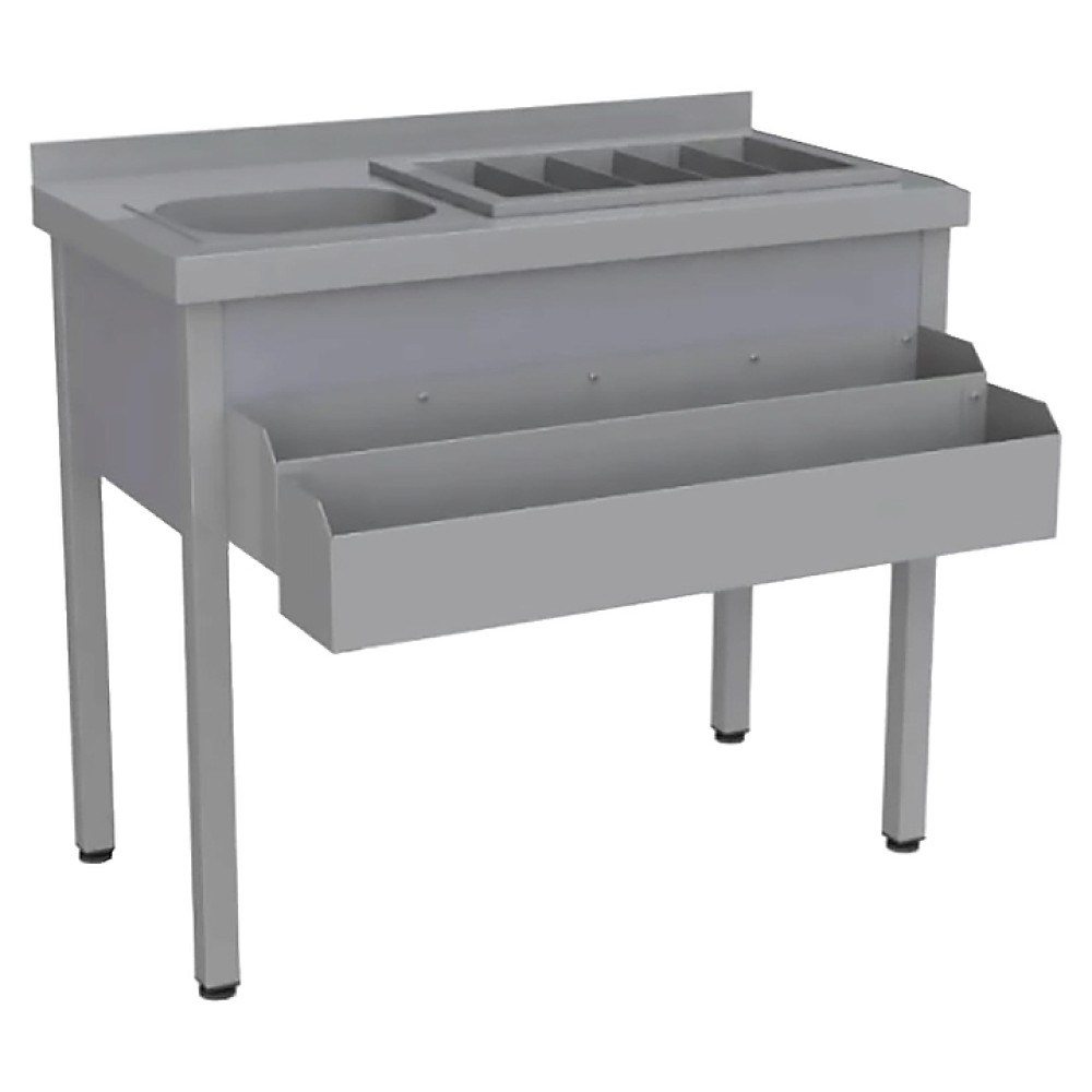 Коктейльная барная станция Restoinox БСНКМ-10/7-Б2К предназначена для организации барного места на предприятиях общественного питания и торговли.Модель оснащена мойкой, теплоизолированной ванной для льда, бортом, фартуком с 3-х сторон и регулируемыми по высоте пластиковыми опорами. Ножки выполнены из квадратной трубы 40х40 мм нержавеющей стали AISI 430, столешница, мойка и фартук - из нержавеющей стали AISI 430.