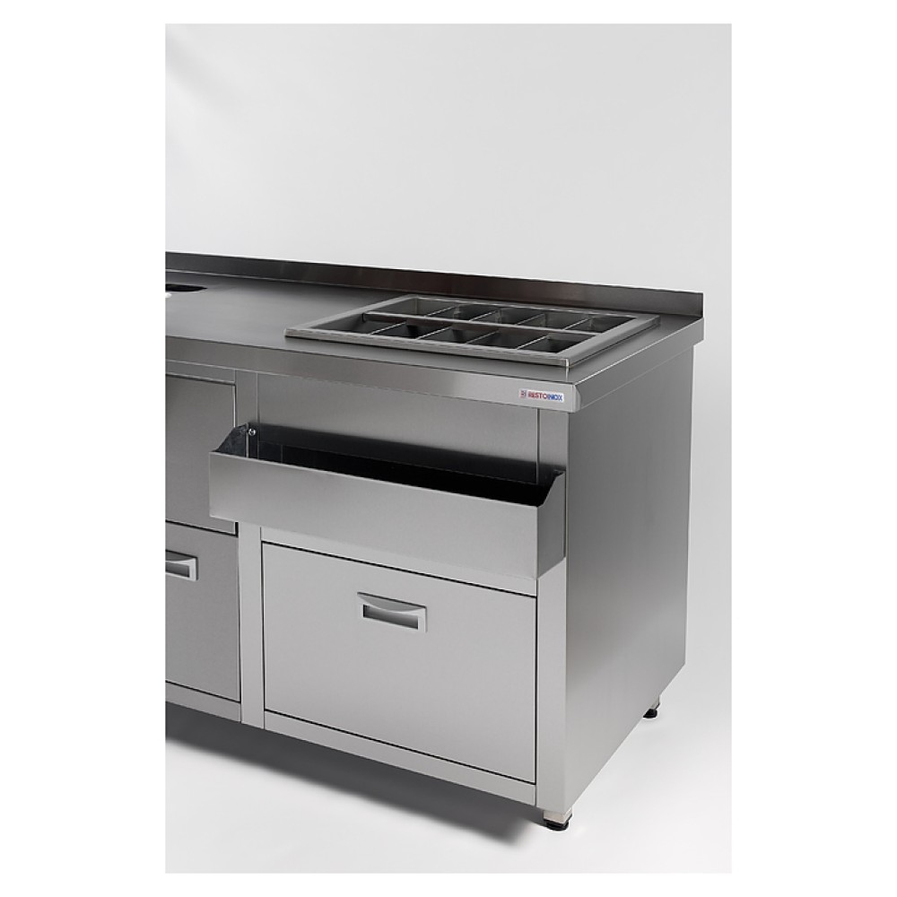 Барная станция Restoinox БСЗ1-15/6-05 предназначена для организации барного места на предприятиях общественного питания и торговли. Модель оснащена мойкой, теплоизолированной ванной для льда, полкой под блендер, карманом для бутылок и 2 выдвижными ящиками. Корпус и столешница выполнены из нержавеющей стали AISI 430.