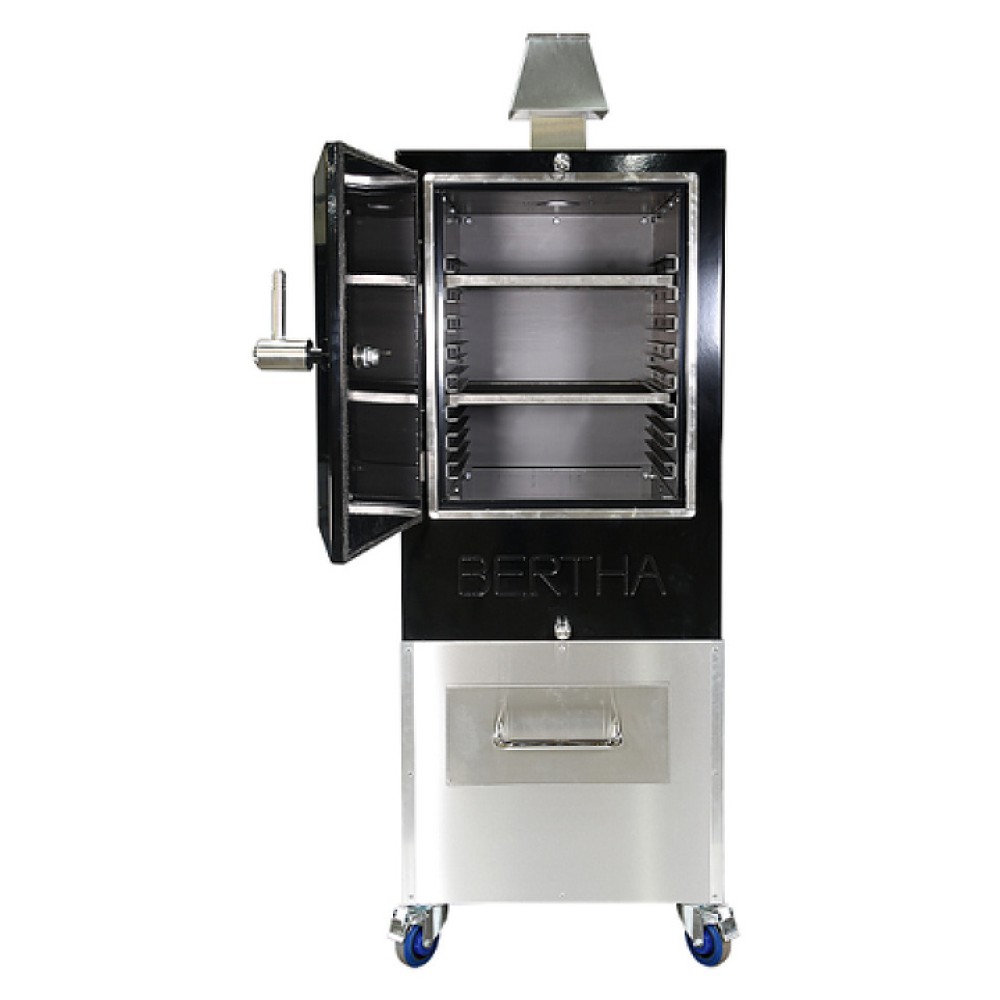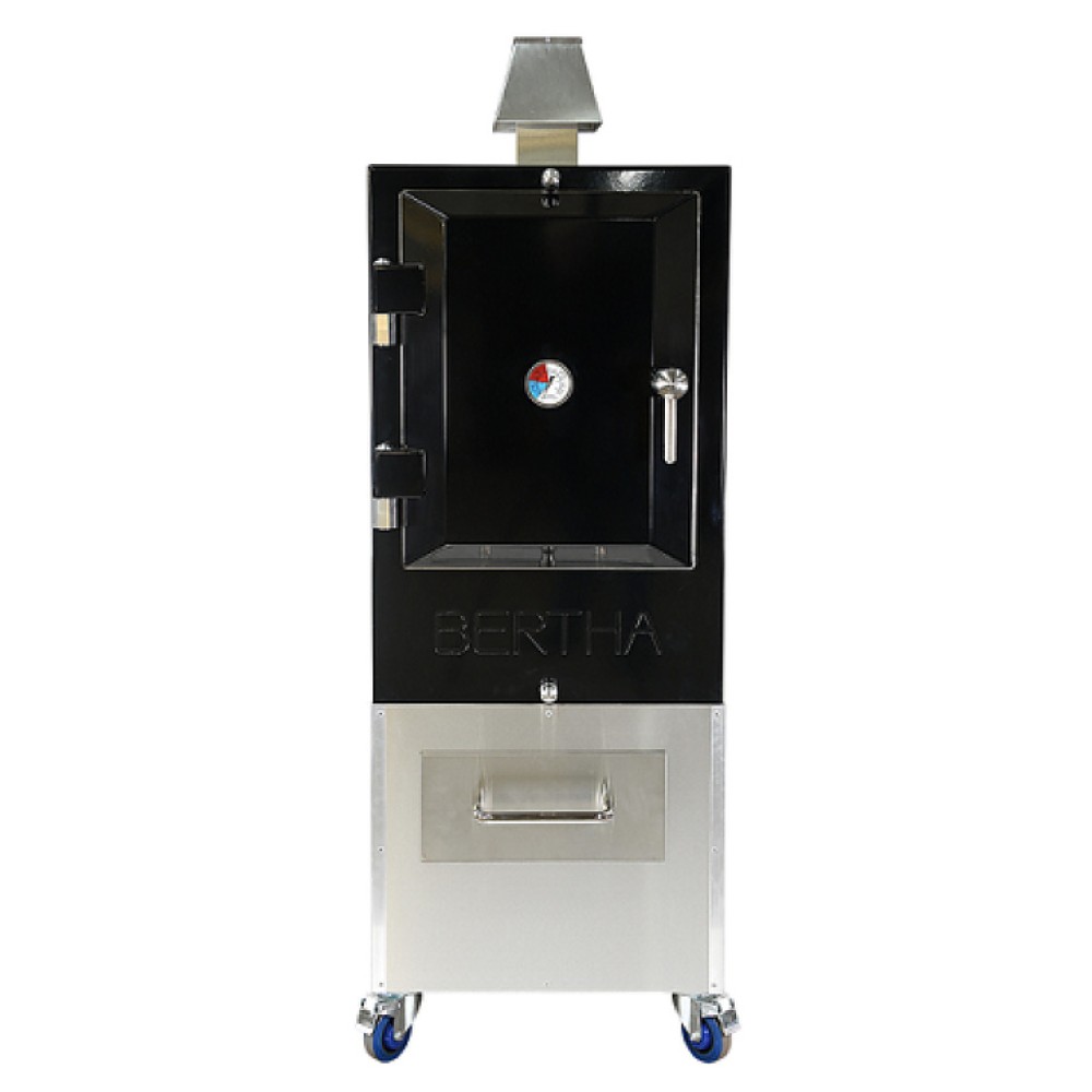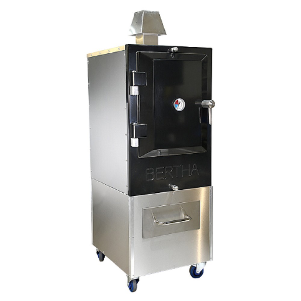 Угольная печь BERTHA-Black предназначена для приготовления широкого спектра блюд на предприятиях общественного питания. Модель оснащена ручкой, регулирующей температуру в камере, аналоговым термометром, встроенным поддоном для сбора жира, зольником и колесами. Корпус выполнен из британского чугуна и нержавеющей стали AISI 304.
