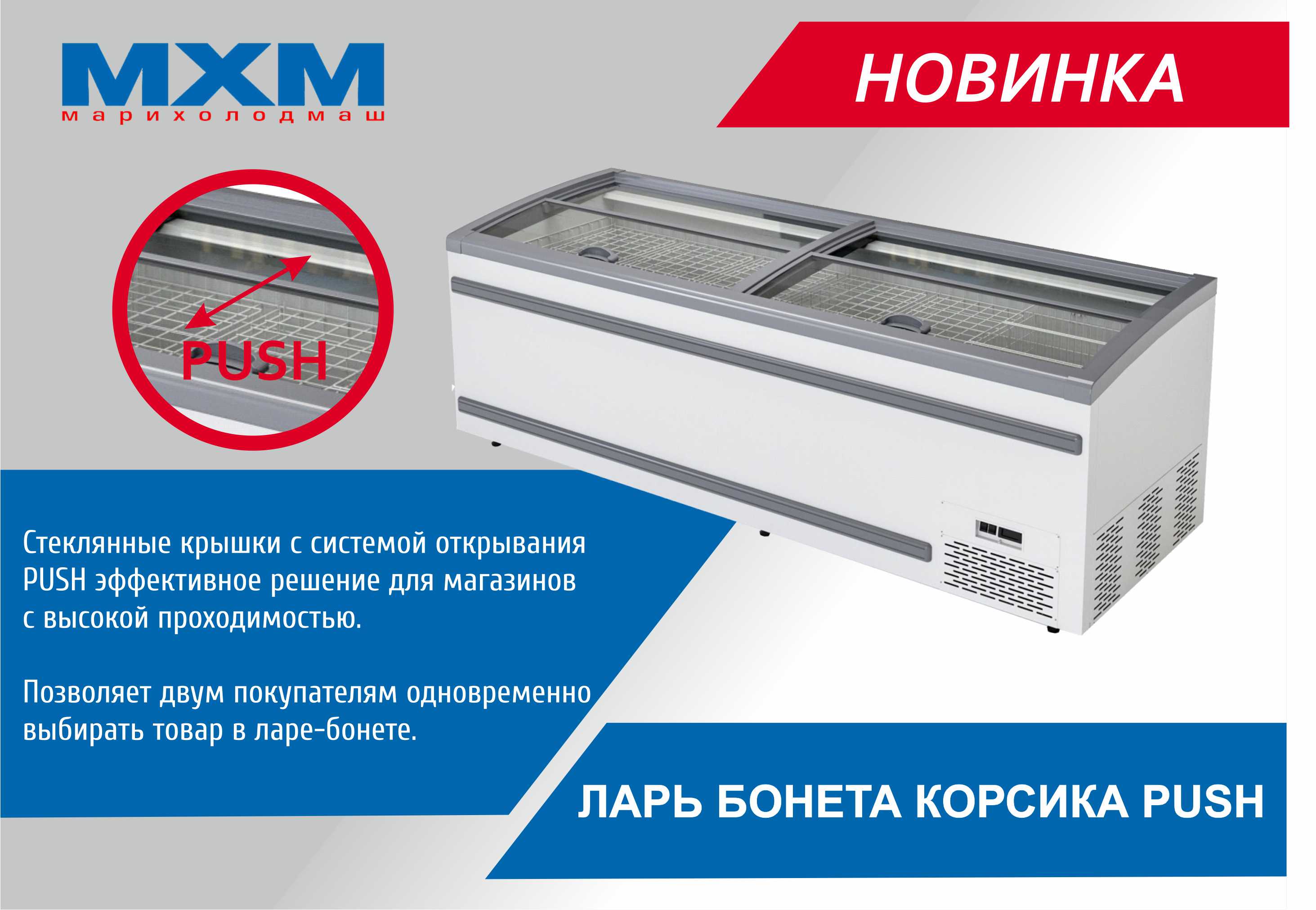 Морозильный ларь-бонета Марихолодмаш Корсика ЛХН-2500 Push предназначен для демонстрации, заморозки и хранения продуктов, полуфабрикатов и мороженого на предприятиях торговли и общественного питания. Корпус выполнен из окрашенной оцинкованной стали с пенополиуретановым заполнением, внутренняя облицовка и полки - из стали, окрашенной белой порошковой краской, крышка - из стекла.