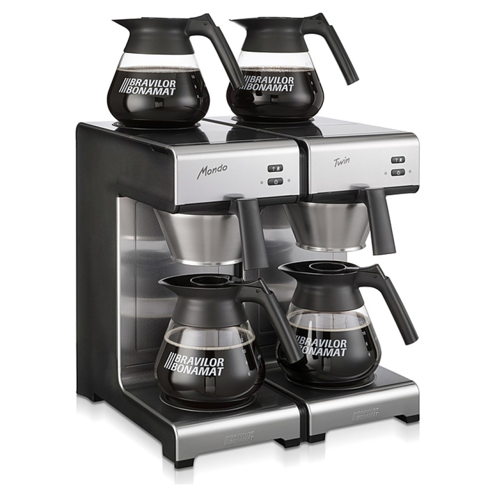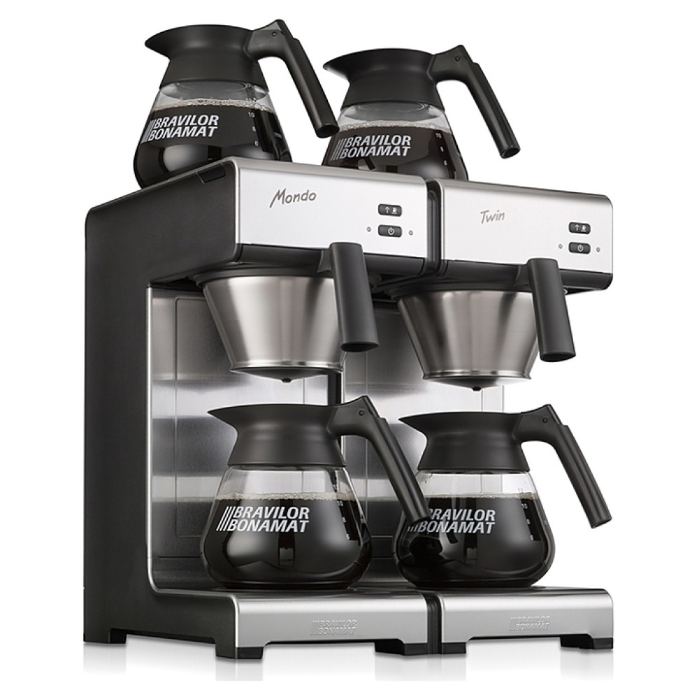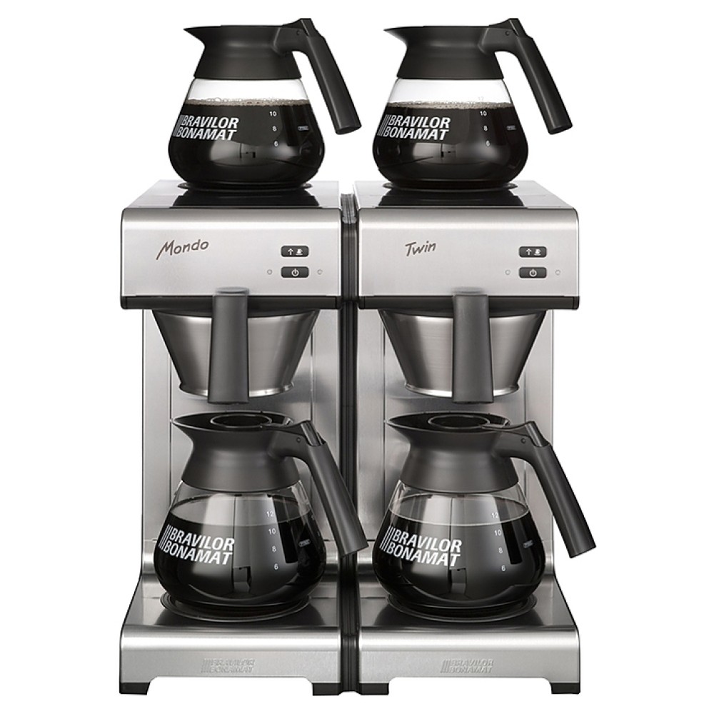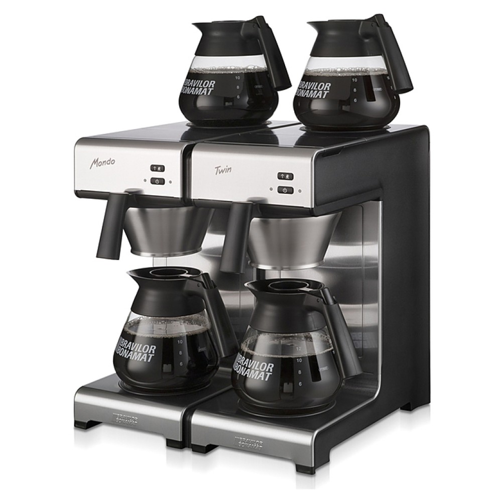 Заливная кофеварка Bravilor Bonamat Mondo Twin используется на предприятиях общественного питания и торговли для приготовления фильтрованного кофе. Модель оснащена 2 системами кофеварения, 4 саморегулируемыми плитами нагрева дна, которые поддерживают оптимальную температуру кофе, индикаторами готовности кофе и удаления накипи. Корпус выполнен из высококачественной нержавеющей стали, черные детали - из синтетических материалов.