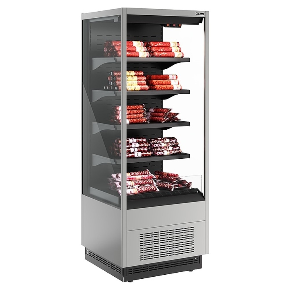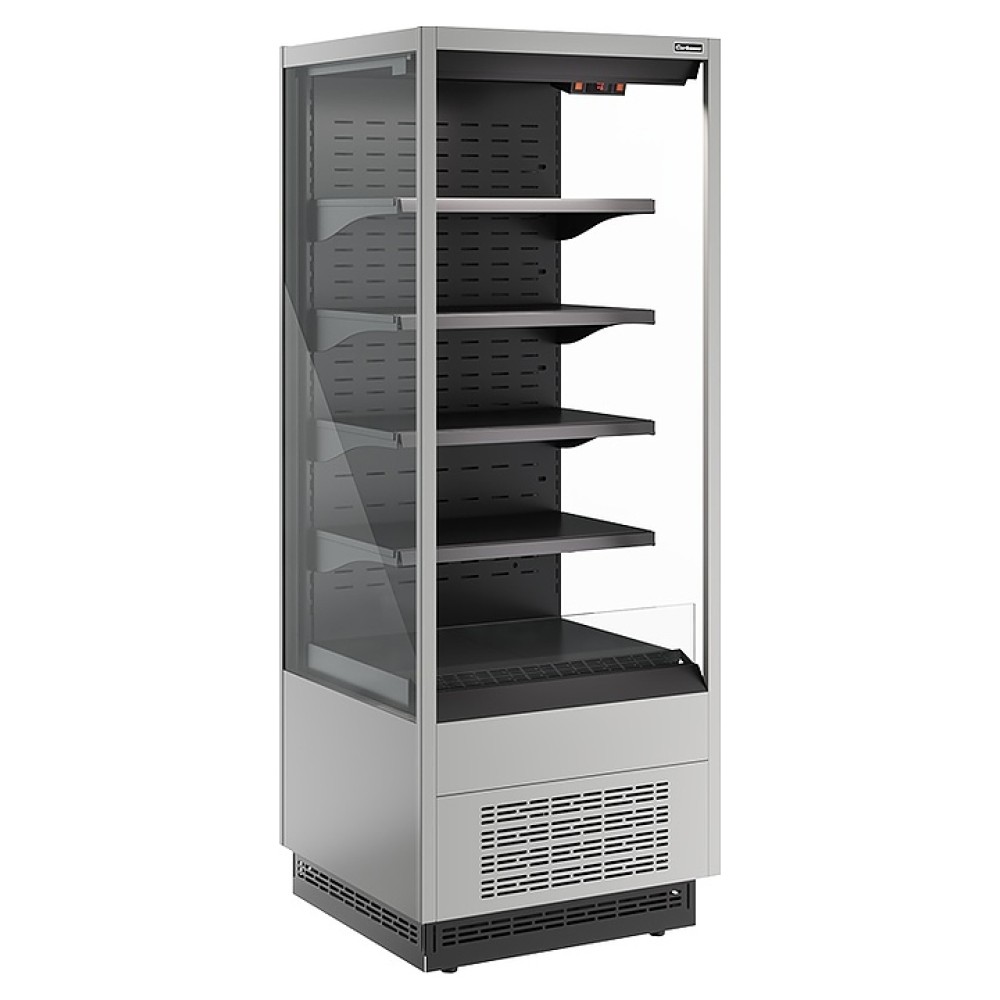 Холодильная горка Carboma FC 20-07 VM 0,6-2 версия 2.0 серии Cube 2 используется на предприятиях общественного питания и торговли для охлаждения, кратковременного хранения и предпродажной демонстрации напитков, мяса, птицы, полуфабрикатов, молочных и гастрономических изделий. Модель оснащена 4 рядами навесных полок с кронштейнами, подставкой с фронтальной термовыводящей и цокольной решетками. Корпус прямоугольно ориентированной формы выполнен из стали с антикоррозийным покрытием внешних панелей, полок и кронштейнов цвета нержавеющая сталь (RAL 0430), цоколя и интерьера черного цвета (RAL 9005), теплоизоляция – из пенополиуретана.