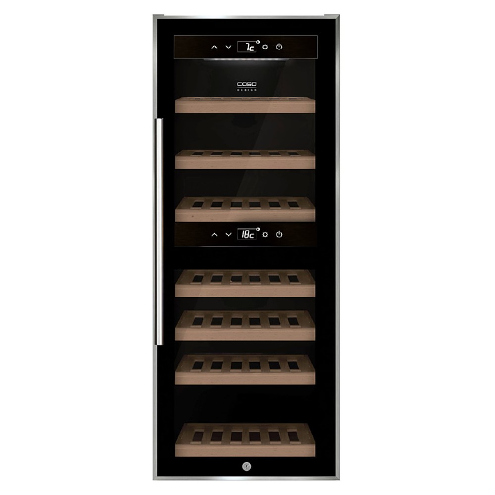 Винный шкаф CASO WineComfort 38 black предназначен для охлаждения и длительного хранения бутилированного и разливного вина в частных домах, квартирах, отелях и офисах. Модель оснащена 2 зонами хранения с независимой установкой температуры и отдельной сенсорной панелью управления для каждой из них, 7 деревянными выдвижными полками. Корпус и ручка выполнены из нержавеющей стали, дверца - из трехслойного стекла с УФ-фильтром.