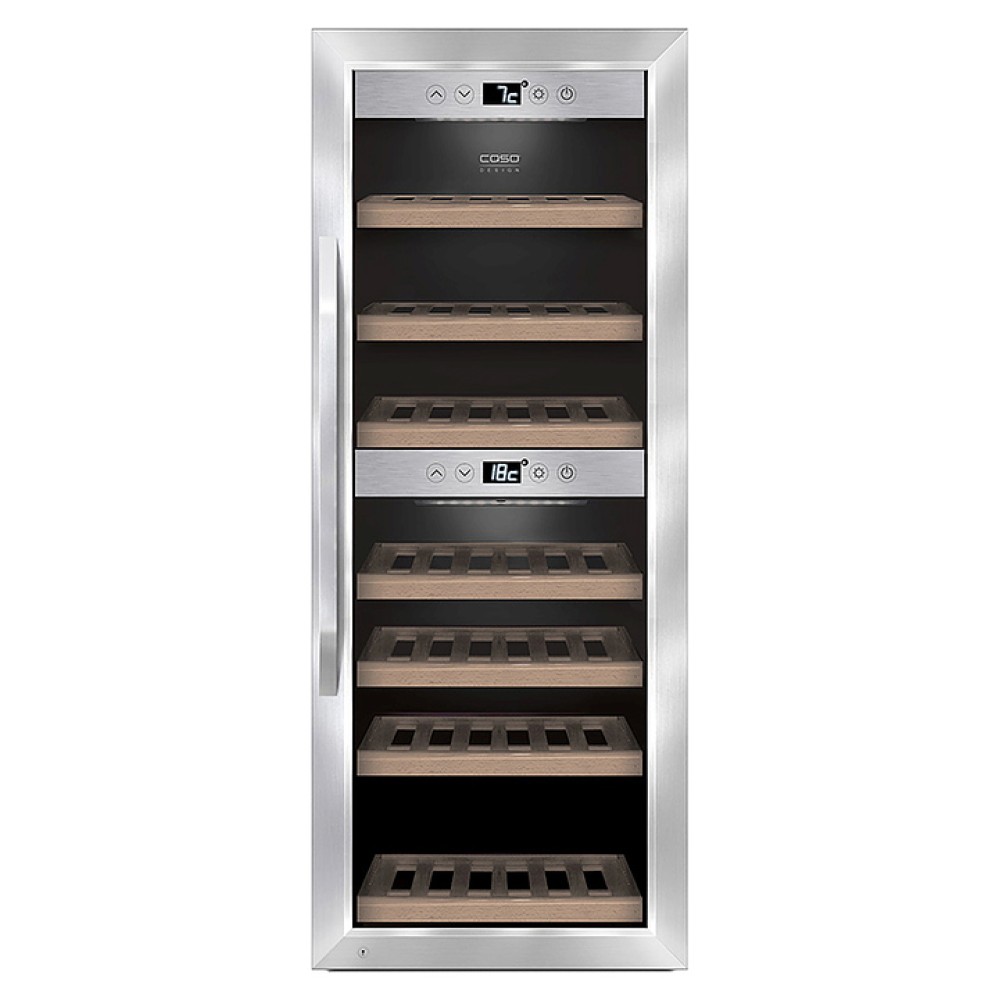 Винный шкаф CASO WineGourmet 38 предназначен для охлаждения и длительного хранения бутилированного и разливного вина в частных домах, квартирах, отелях и офисах. Модель оснащена 2 зонами хранения с независимой установкой температуры и отдельными сенсорными панелями управления для каждой из них и 7 деревянными выдвижными полками. Дверная рама и ручка выполнены из нержавеющей стали, дверца - из стекла с ультрафиолетовым фильтром.