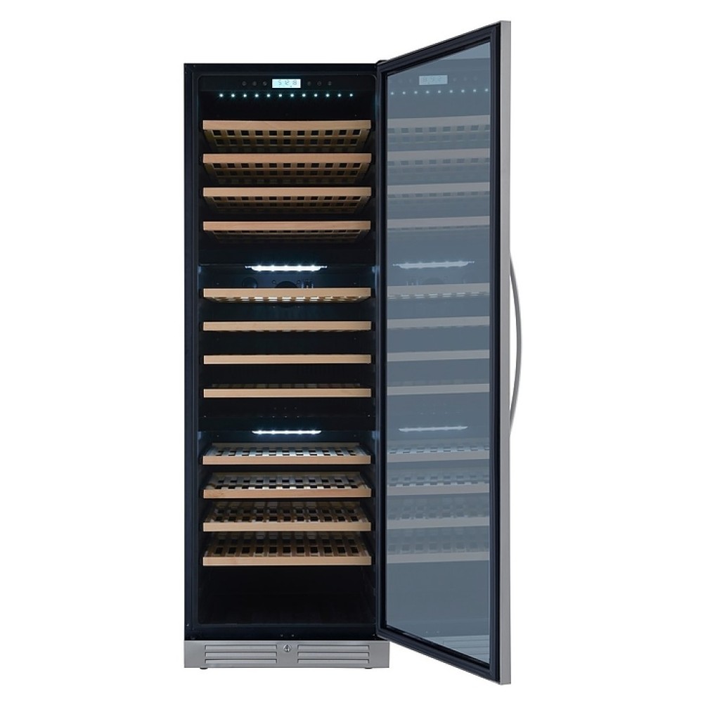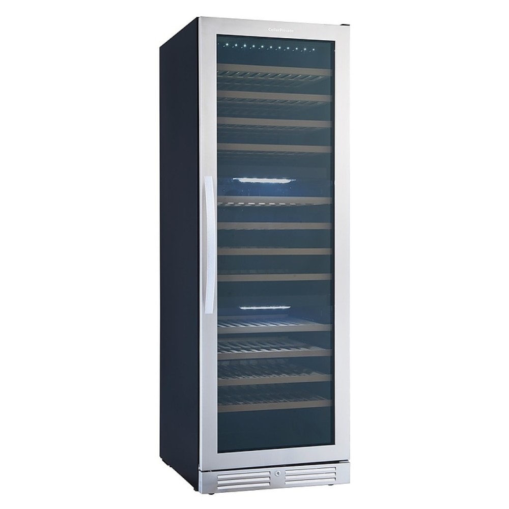 Винный шкаф Cellar Private CP154-3T создает оптимальные условия для сохранения всех вкусовых свойств разливного вина в барах, ресторанах, специализированных магазинах, частных домах или квартирах. Модель оснащена цифровым дисплеем, сенсорным управлением, выключаемой светодиодной подсветкой холодного белого цвета, замком и 12 съемными полками. Корпус выполнен из окрашенного металла, дверь - из металлической рамы и двойного тонированного стеклопакета с УФ-фильтром, полки - из древесины.