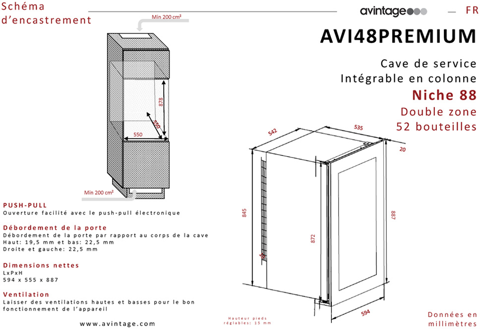 Винный шкаф Climadiff Avintage AVI48PREMIUM предназначен для хранения вина при определенном уровне влажности и температуры в ресторанах, специализированных магазинах, отелях, подсобных складских помещениях, в частных домах или квартирах. Модель оснащена светодиодным дисплеем и активным вентилятором для обеспечения равномерной температуры в камере.