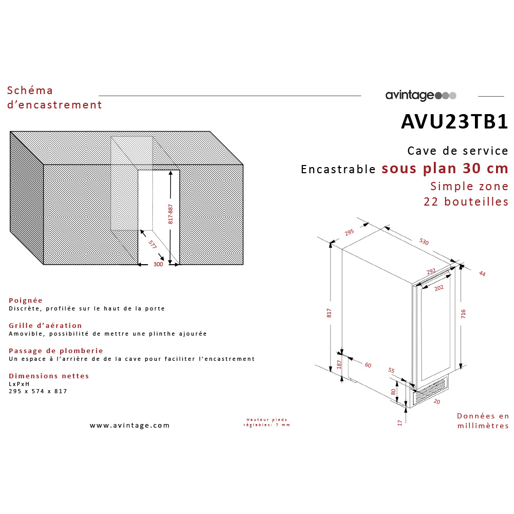 Винный шкаф Climadiff Avintage AVU23TB1 предназначен для хранения при оптимальных условиях и демонстрации бутилированного вина различных сортов в барах, ресторанах, специализированных магазинах, складских помещениях, гостиницах, а также домашних условиях. Модель оснащена монотемпературной холодильной камерой, правосторонней перенавешиваемой распашной дверью на скрытых петлях, обзорным остеклением, кабелем питания с вилкой, расположенной внутри камеры панелью управления с сенсорными клавишами и светодиодным дисплеем с белой подсветкой индикации. Корпус и рукоятка выполнены из металла с антикоррозийным покрытием черного цвета, внутренняя облицовка камеры черного цвета, полки – из стали с фронтом из массива буковой древесины.
