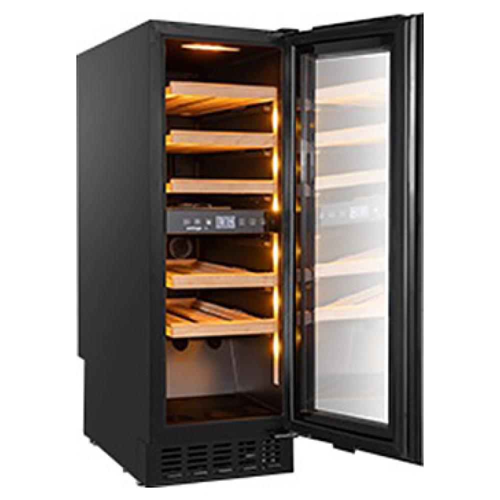 Винный шкаф Climadiff Avintage AVU31D88 предназначен для хранения при оптимальных условиях и демонстрации бутилированного вина различных сортов в барах, ресторанах, специализированных магазинах, складских помещениях, гостиницах, а также домашних условиях. Модель оснащена холодильной камерой с 2 независимыми температурными зонами, правосторонней перенавешиваемой распашной дверью на скрытых петлях, обзорным остеклением, кабелем питания с вилкой, расположенной внутри камеры панелью управления с сенсорными клавишами и дисплеем с голубой подсветкой индикации. Корпус и рукоятка выполнены из металла с антикоррозийным покрытием черного цвета, внутренняя облицовка камеры черного цвета, полки – из массива буковой древесины.