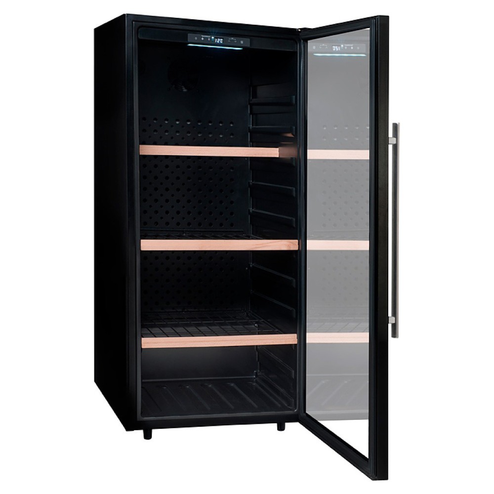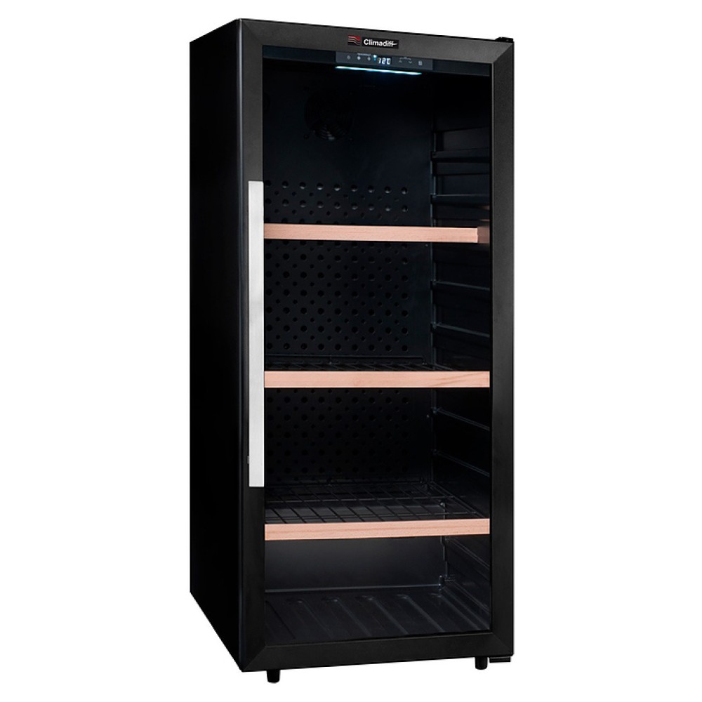 Винный шкаф Climadiff CPW160B1 предназначен для кратковременного хранения вина при определенном уровне влажности и температуры в ресторанах, специализированных магазинах, отелях, подсобных складских помещениях, в частных домах или квартирах и подготовки вина к подаче на стол. Модель оснащена сенсорным цифровым дисплеем, отключаемой внутренней подсветкой белого цвета и 2 транспортировояными роликами спереди, 2 регулируемыми по высоте ножками. Дверь выполнена из двойного закаленного стекла с защитой от УФ-лучей, полки - из натурального дерева с декором, ручка - из нержавеющей стали.