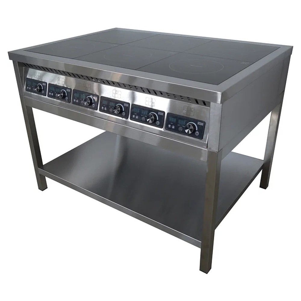 Индукционная плита ЦМИ ПИ-6 предназначена для приготовления различных блюд в наплитной посуде на предприятиях общественного питания и торговли. Нагрев рабочей поверхности осуществляется моментально, вследствие чего затрачивается меньшее количество электроэнергии. Корпус выполнен из нержавеющей стали, сплошная полка - из нержавеющего листа AISI 430 толщиной 0,8 мм, ножки каркаса - из нержавеющей трубы 40х40х1,5 AISI 430.