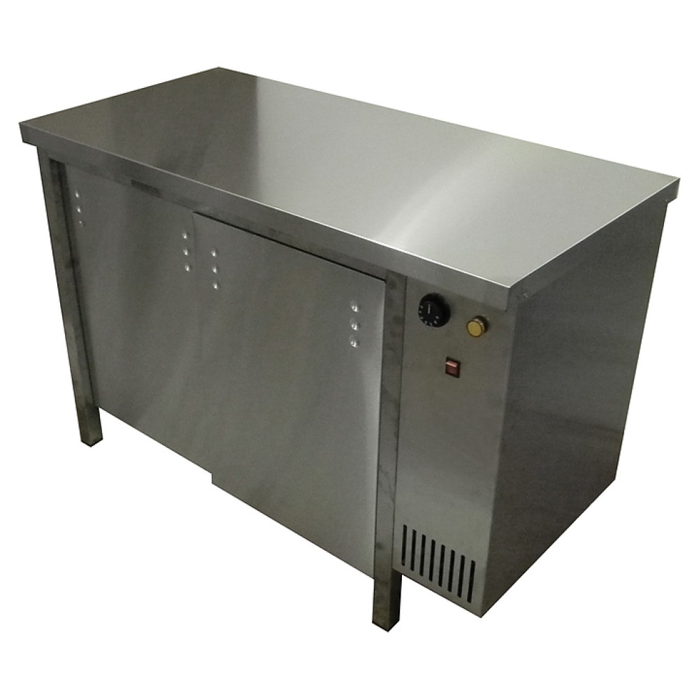 Тепловой стол ЦМИ СТТпДК-140/60 используется для подогрева тарелок перед сервировкой, а также для сохранения блюд и напитков в горячем виде на предприятиях общественного питания и торговли. Модель оснащена терморегулятором в правой фронтальной части изделия, кнопками включения и выключения, лампой индикации, 2 дверьми-купе, 4 устойчивыми ножками и вентилятором. Изделие полностью выполнено из нержавеющей стали.