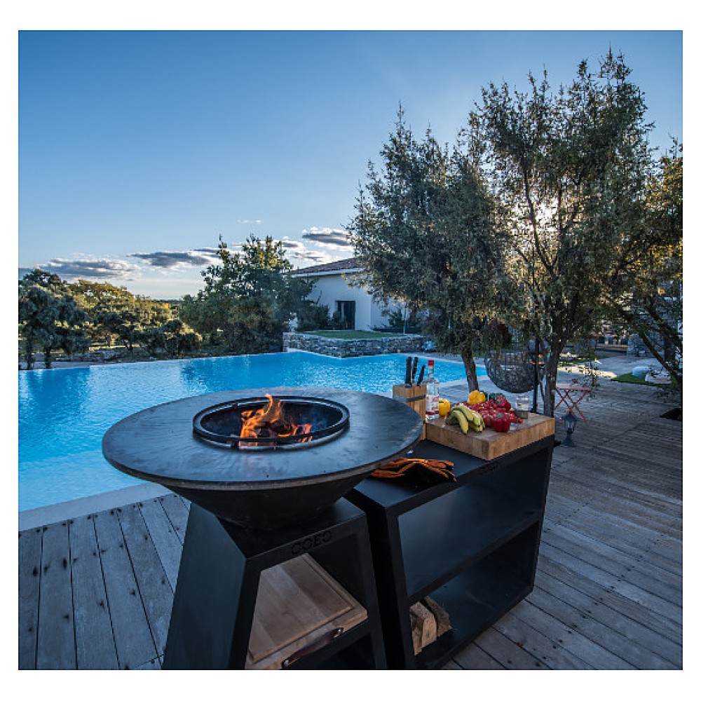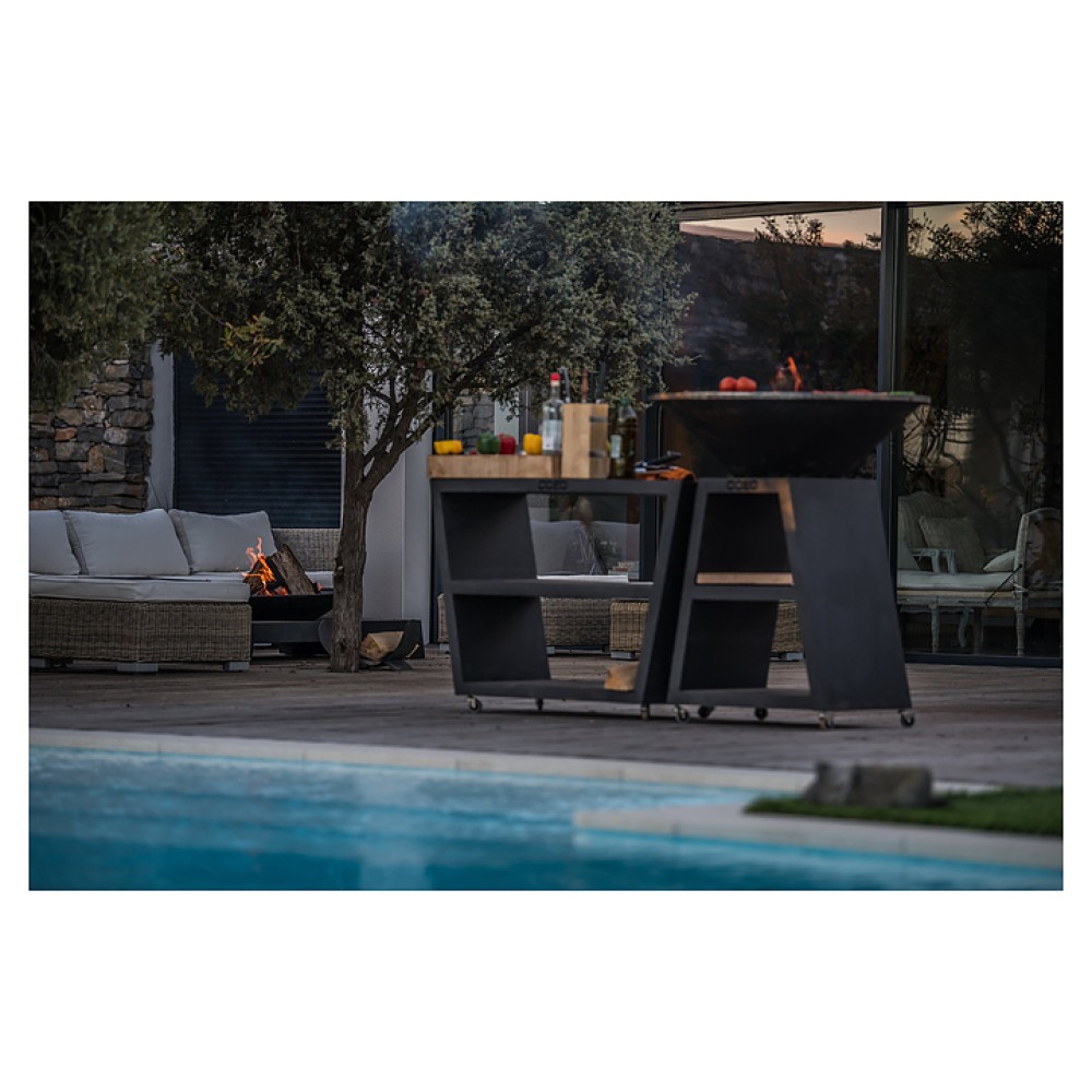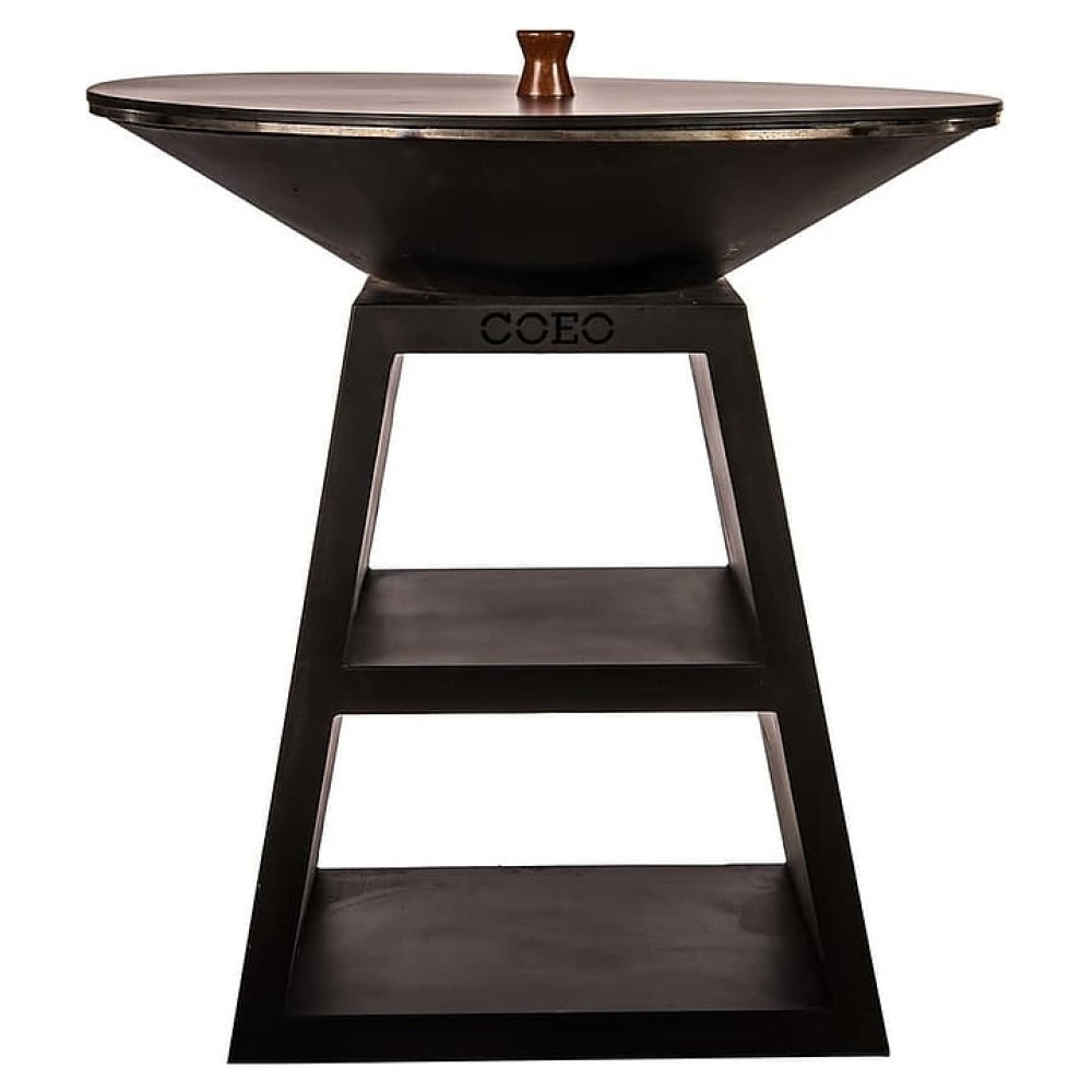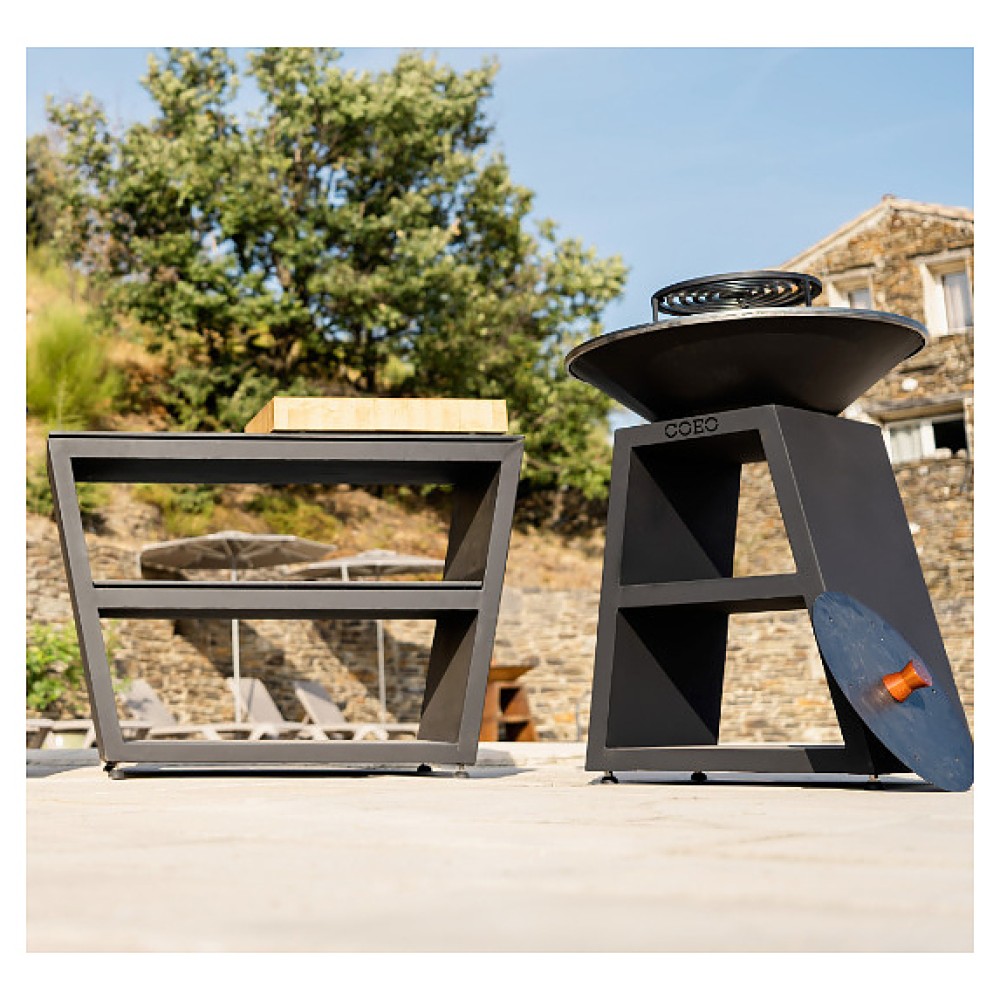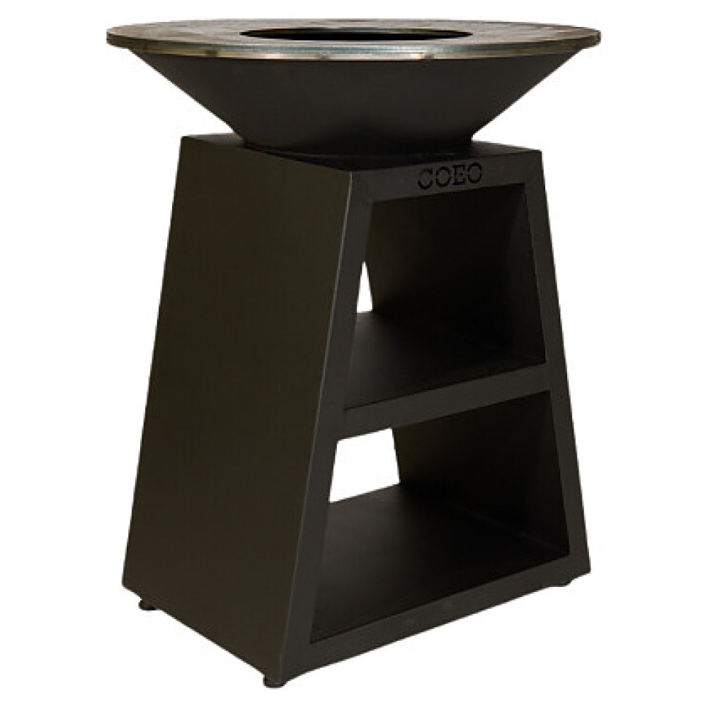 Уличный гриль COEO TRIO 82 серии Brasero используется на уличных площадках баров, кафе, других небольших предприятий общественного питания, кемпингов, частных домов и дач для жарки овощей, рыбы, приготовления шашлыка, а также различных тушеных блюд в чугунной посуде. Модель оснащена трапецевидной подставкой, конически расширенным кверху очагом и съемной круглой планчой с расположенной под небольшим наклоном к широкому отверстию в центре рабочей поверхностью. Подставка и очаг выполнены из высококачественной устойчивой к атмосферным воздействиям горячеоцинкованной стали с матовым покрытием порошковой краской черного цвета, планча – из безопасной для пищевой продукции толстостенной стали с серебристой поверхностью.
