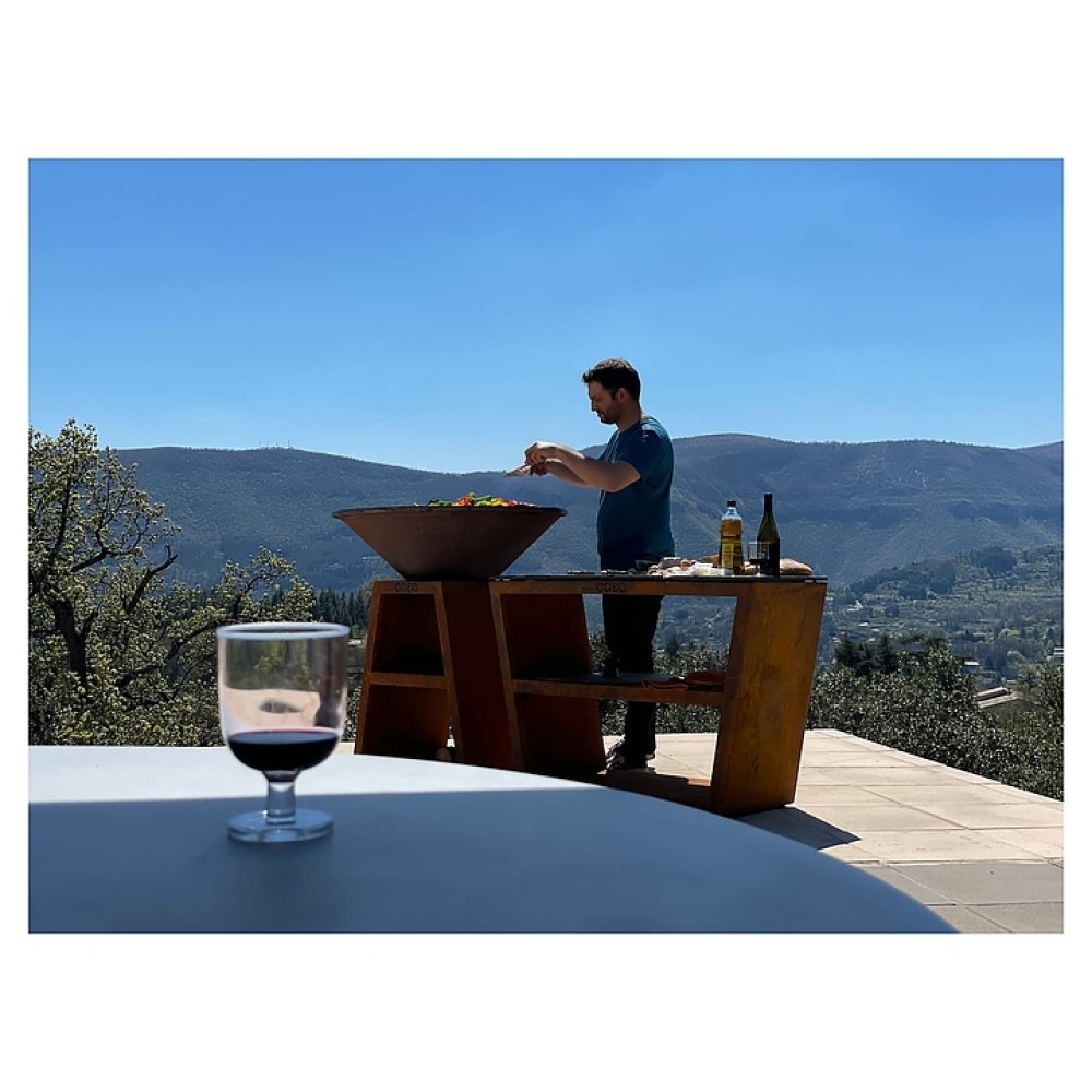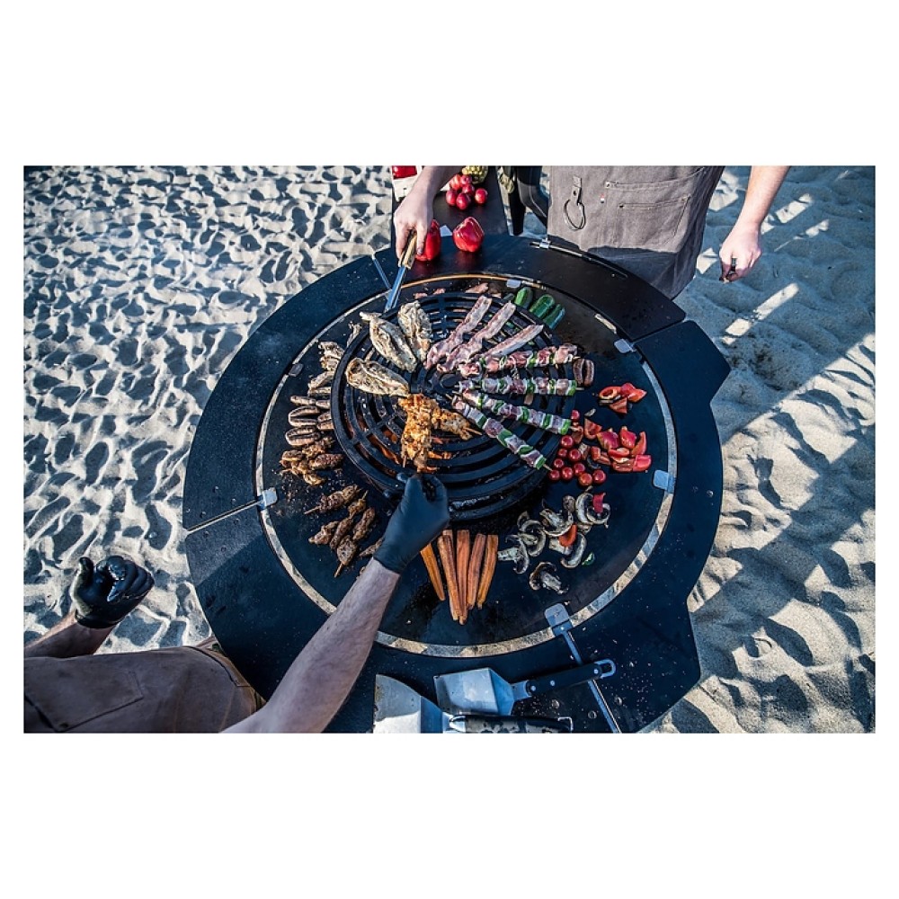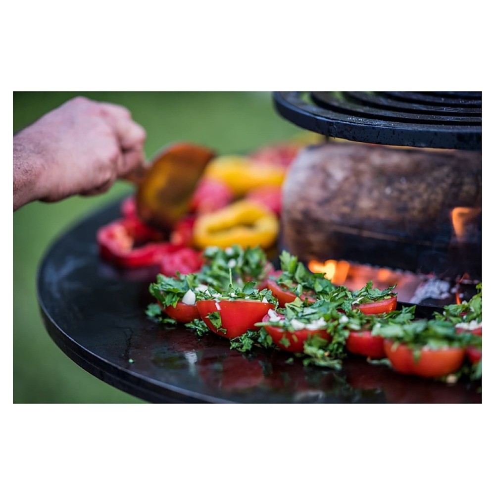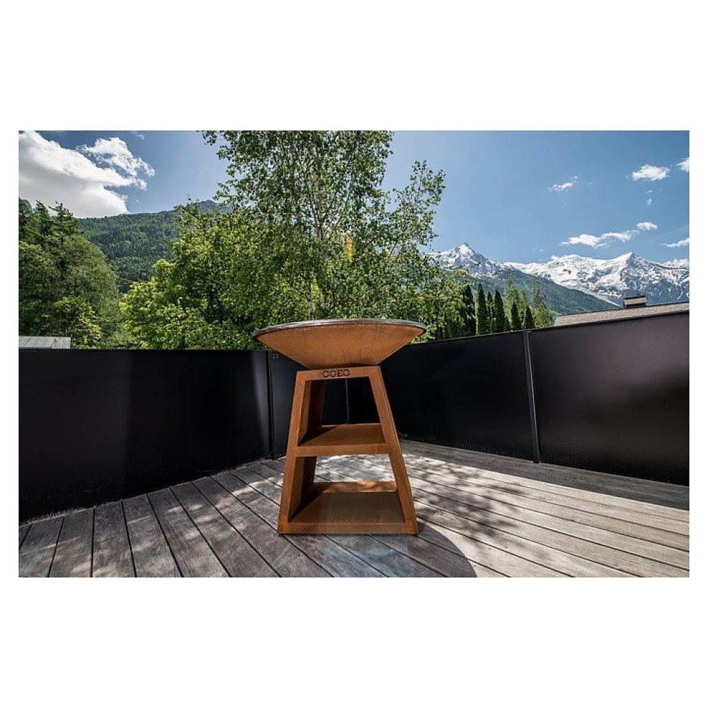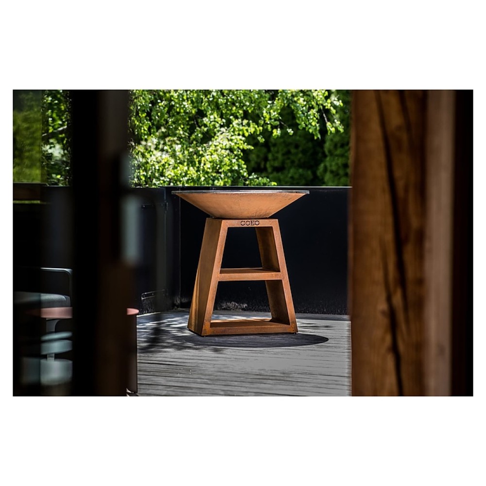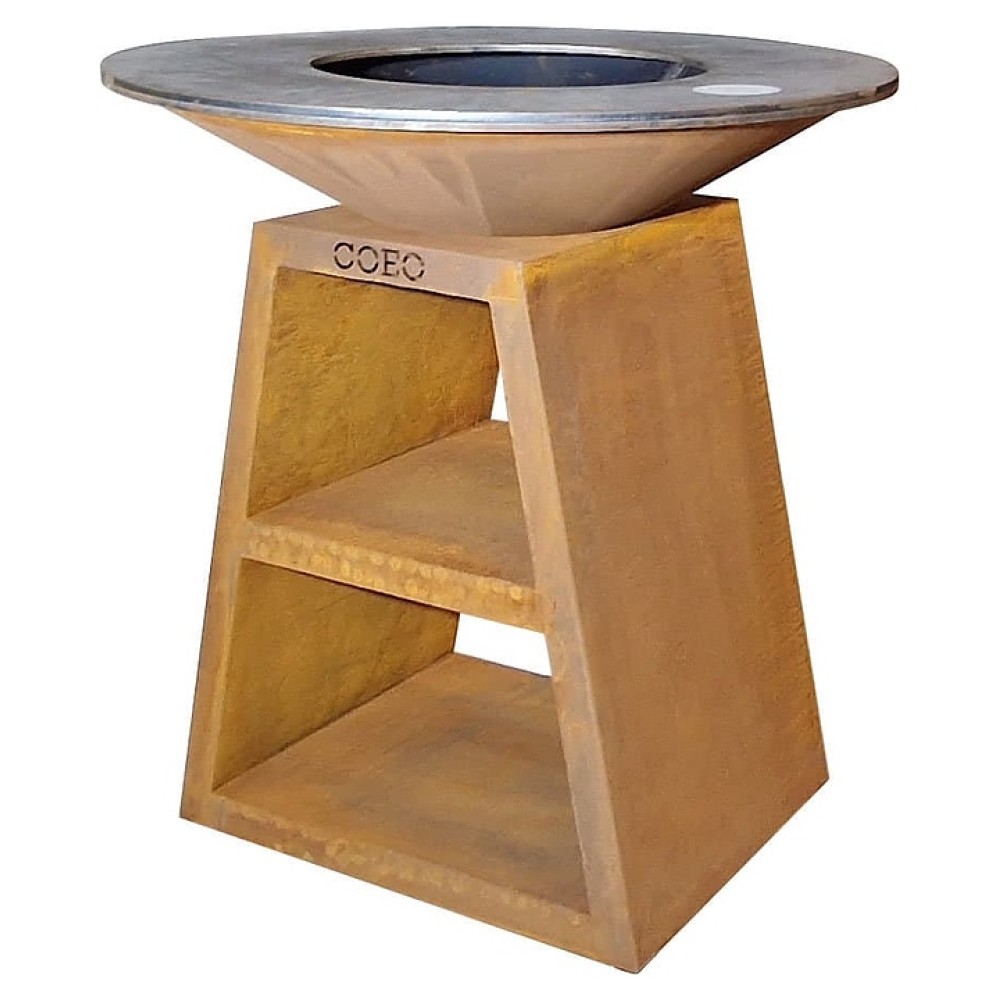 Уличный гриль COEO TRIO 98 серии Brasero используется на уличных площадках баров, кафе, других небольших предприятий общественного питания, кемпингов, частных домов и дач для жарки овощей, рыбы, приготовления шашлыка, а также различных тушеных блюд в чугунной посуде. Модель оснащена трапецевидной подставкой, конически расширенным кверху очагом и съемной круглой планчой с расположенной под небольшим наклоном к широкому отверстию в центре рабочей поверхностью. Подставка и очаг выполнены из высококачественной устойчивой к атмосферным воздействиям кортеновской стали (Corten) с характерной ржавой поверхностью, планча – из безопасной для пищевой продукции толстостенной стали с серебристой поверхностью.