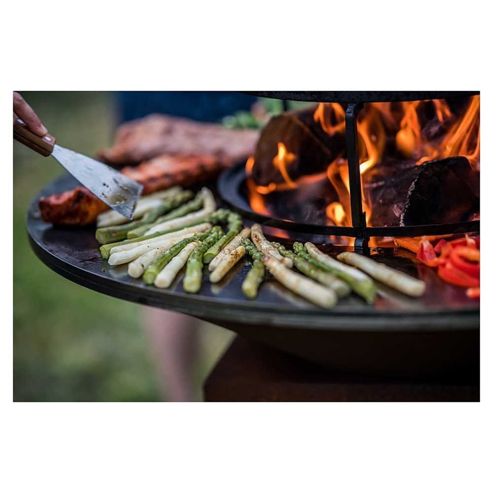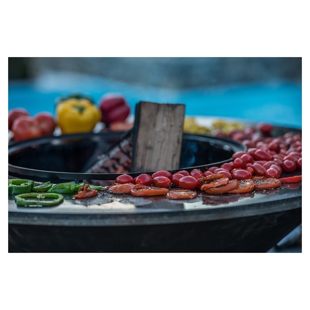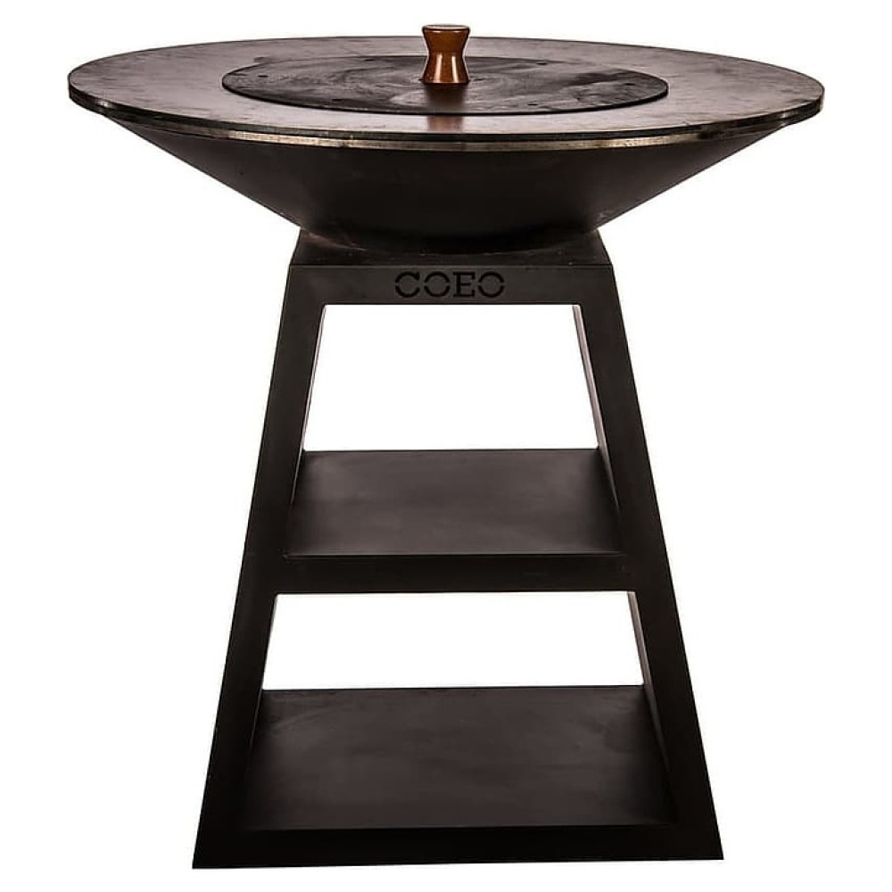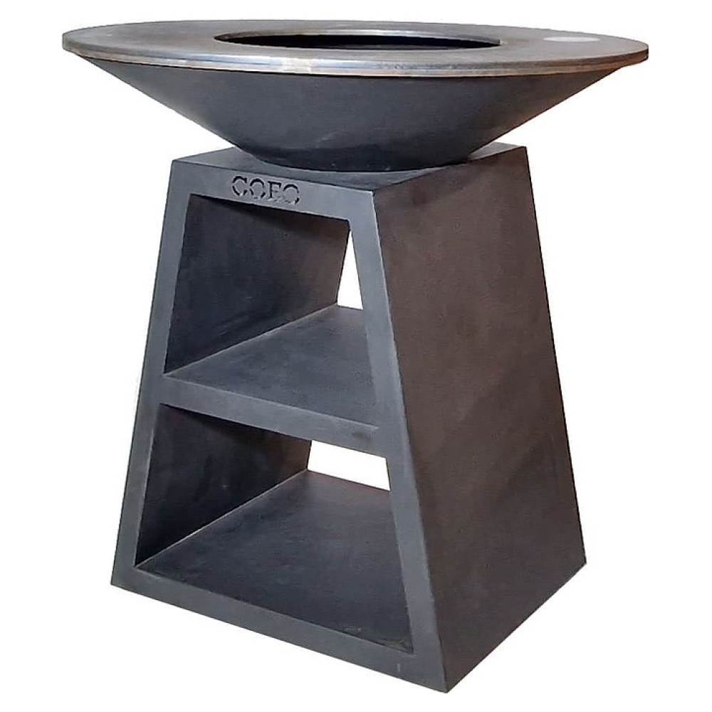 Уличный гриль COEO TRIO 98 серии Brasero используется на уличных площадках баров, кафе, других небольших предприятий общественного питания, кемпингов, частных домов и дач для жарки овощей, рыбы, приготовления шашлыка, а также различных тушеных блюд в чугунной посуде. Модель оснащена трапецевидной подставкой, конически расширенным кверху очагом и съемной круглой планчой с расположенной под небольшим наклоном к широкому отверстию в центре рабочей поверхностью. Подставка и очаг выполнены из высококачественной устойчивой к атмосферным воздействиям горячеоцинкованной стали с матовым покрытием порошковой краской черного цвета, планча – из безопасной для пищевой продукции толстостенной стали с серебристой поверхностью.