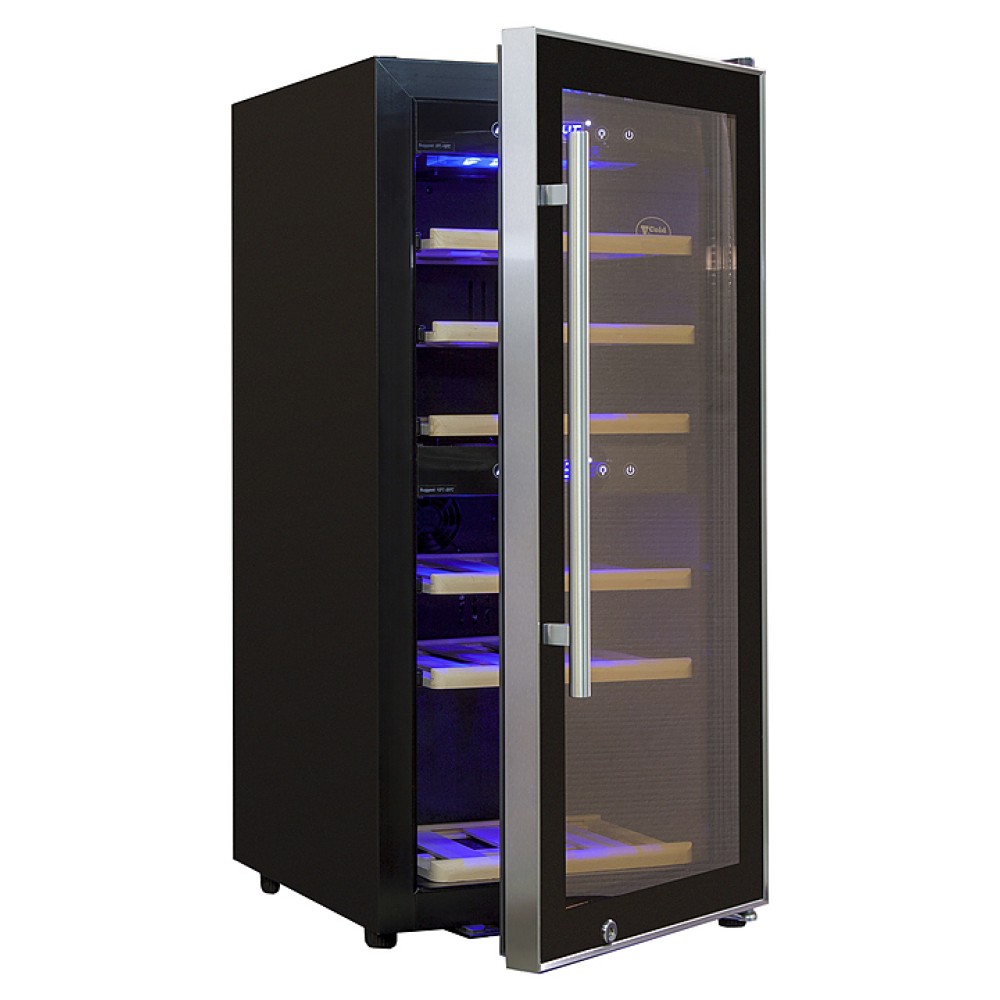 Винный шкаф Cold Vine C24-KBF2 создает оптимальные условия для сохранения всех вкусовых свойств разливного вина. Модель оснащена 6 деревянными полками без лакового покрытия, 5 из которых оснащены метабоксами, и голубой светодиодной подсветкой. Дверь выполнена в черной стальной окантовке и двойного тонированного стекла с защитой от УФ-лучей.