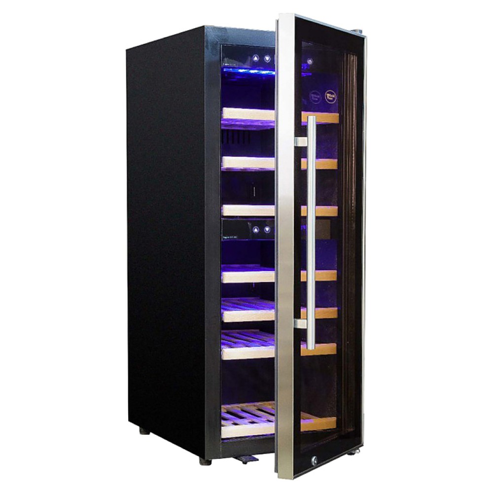 Винный шкаф Cold Vine C38-KBF2 создает оптимальные условия для сохранения всех вкусовых свойств разливного вина. Модель оснащена 7 деревянными полками без лакового покрытия, 6 из которых оснащены метабоксами, и голубой светодиодной подсветкой. Дверь выполнена в черной стальной окантовке и двойного тонированного стекла с защитой от УФ-лучей.