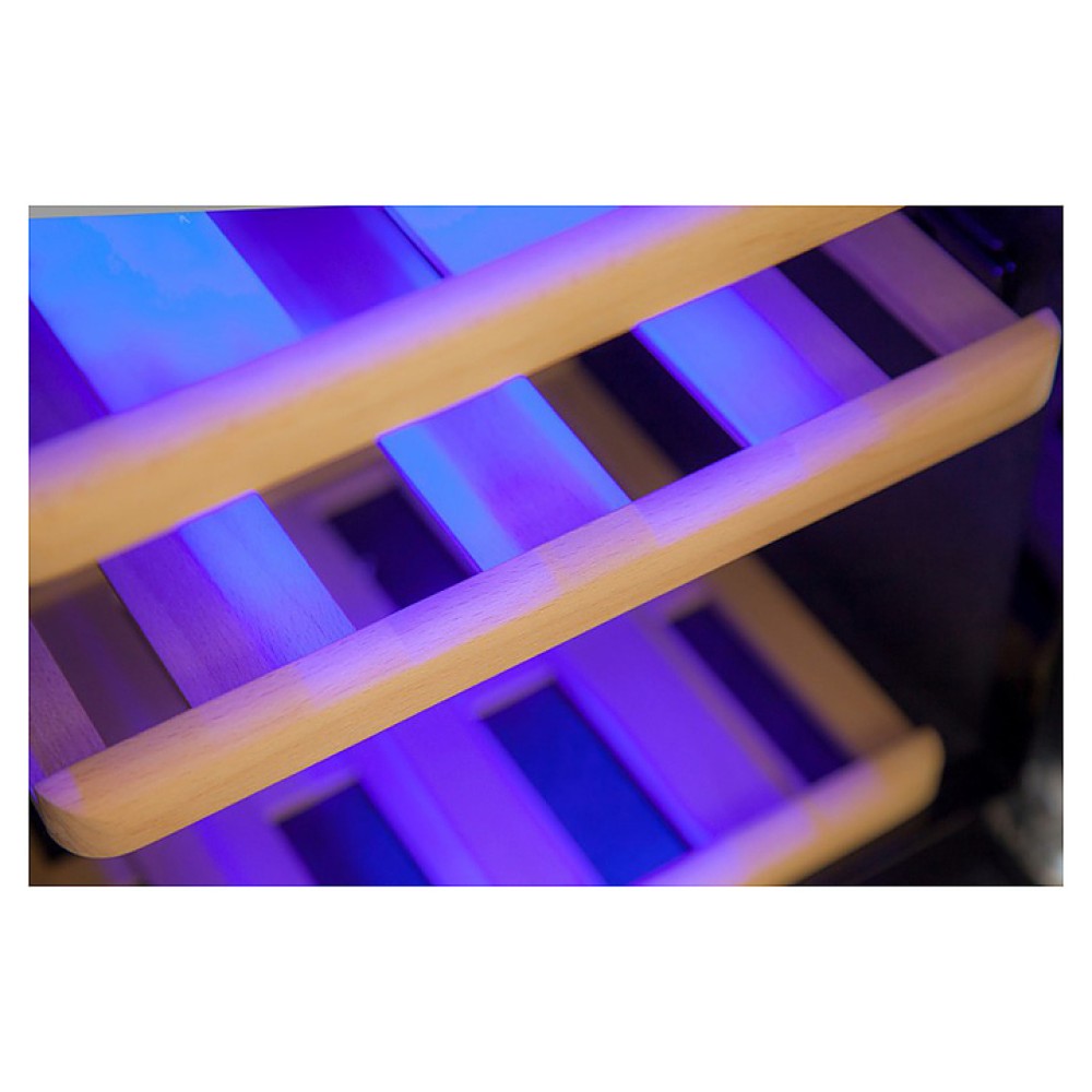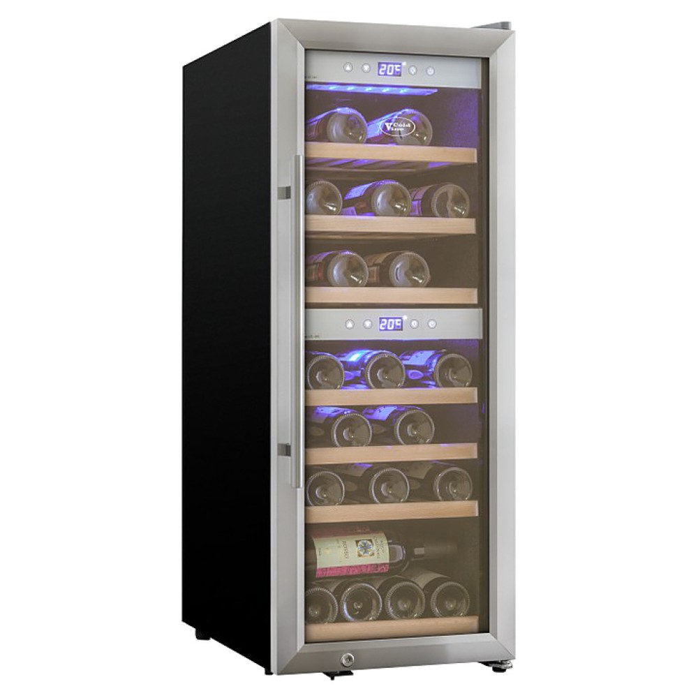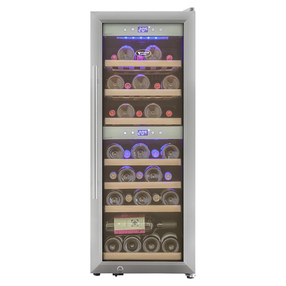 Винный шкаф Cold Vine C38-KSF2 создает оптимальные условия для сохранения всех вкусовых свойств разливного вина. Модель оснащена встроенным вентилятором, 7 деревянными полками, 6 из которых на метабоксах и голубой светодиодной подсветкой. Корпус выполнен из окрашенной в черный цвет стали, дверь со стальной рамой - из тонированного стеклопакета с защитой от УФ-излучения.