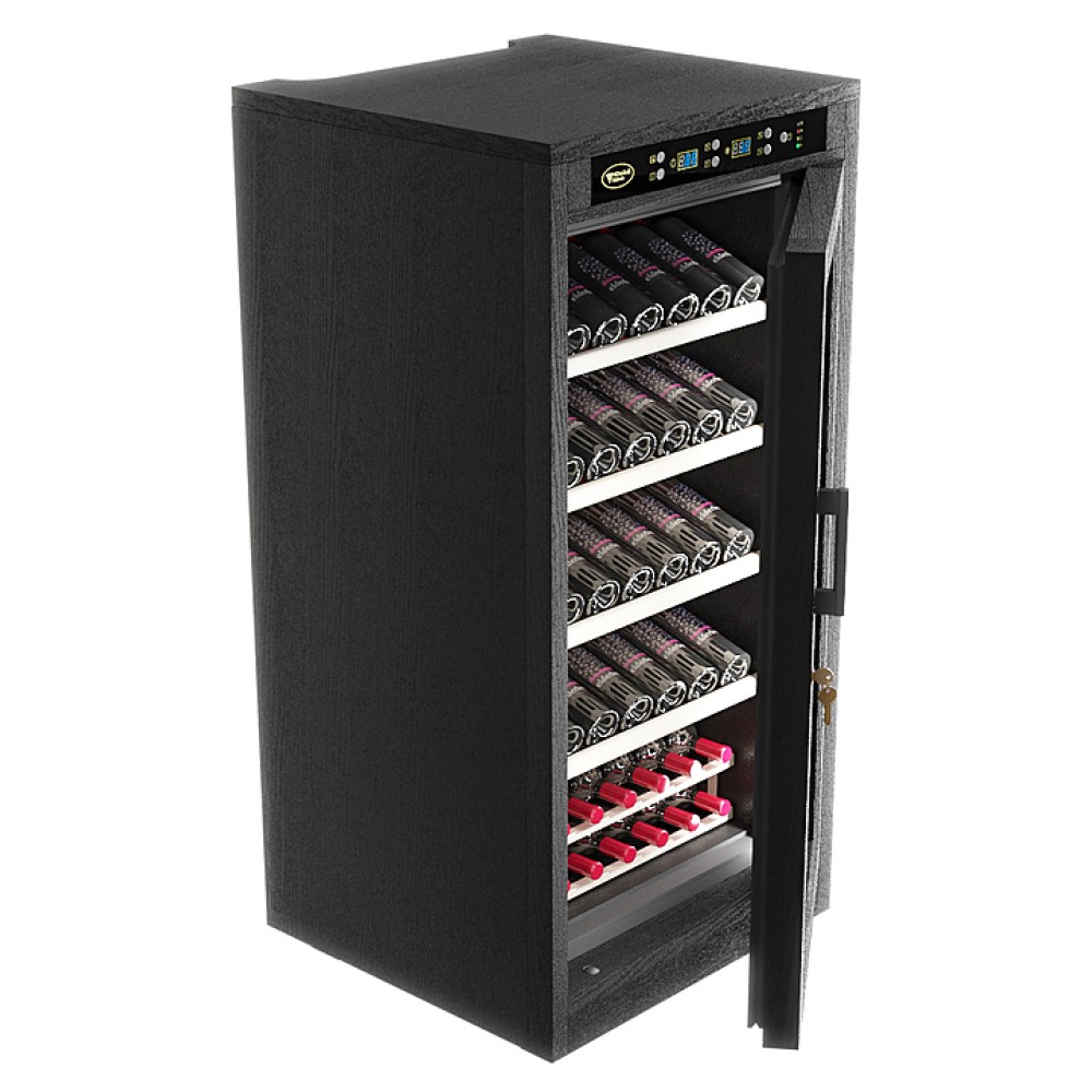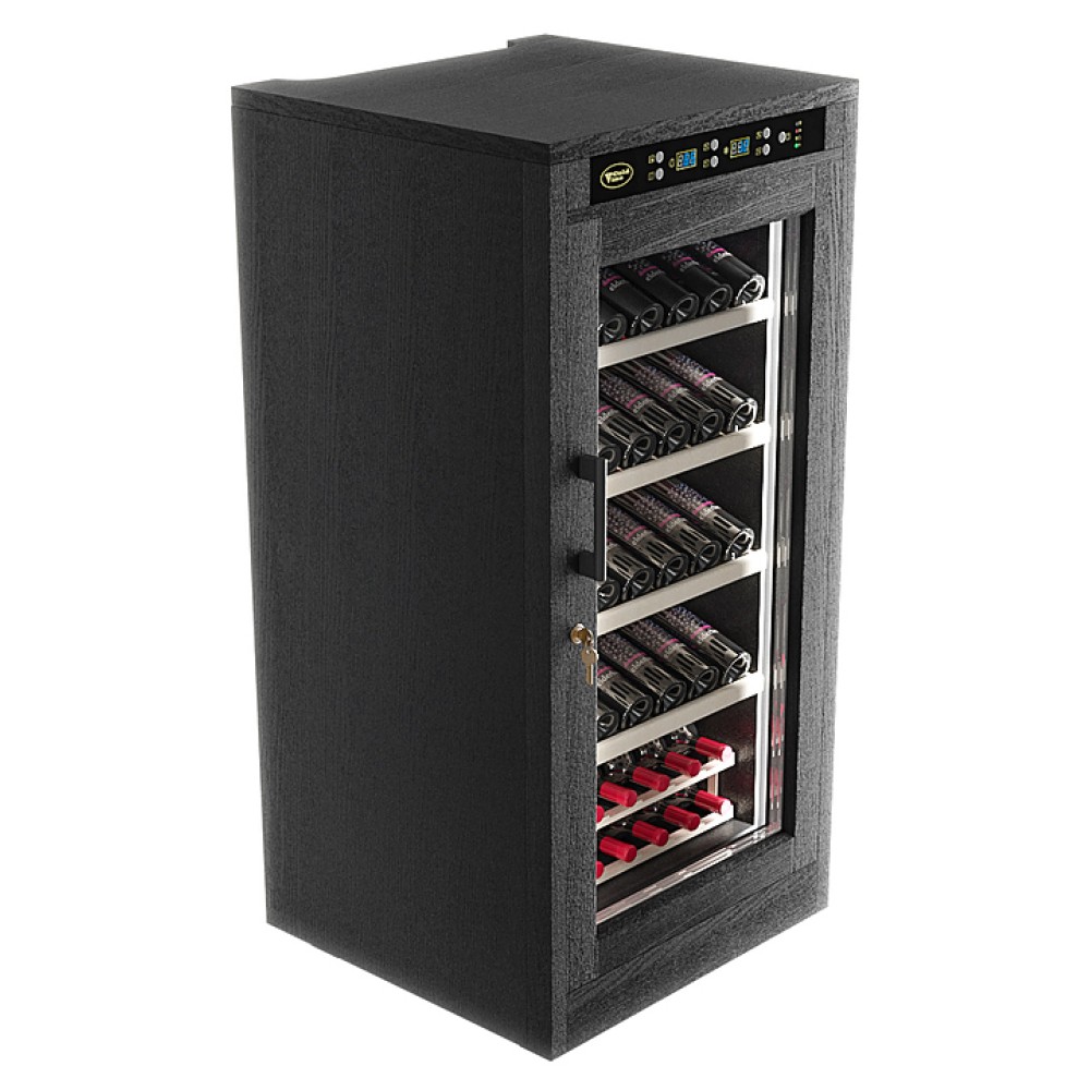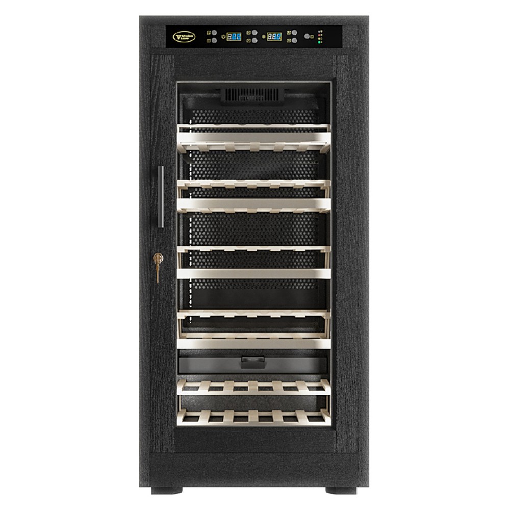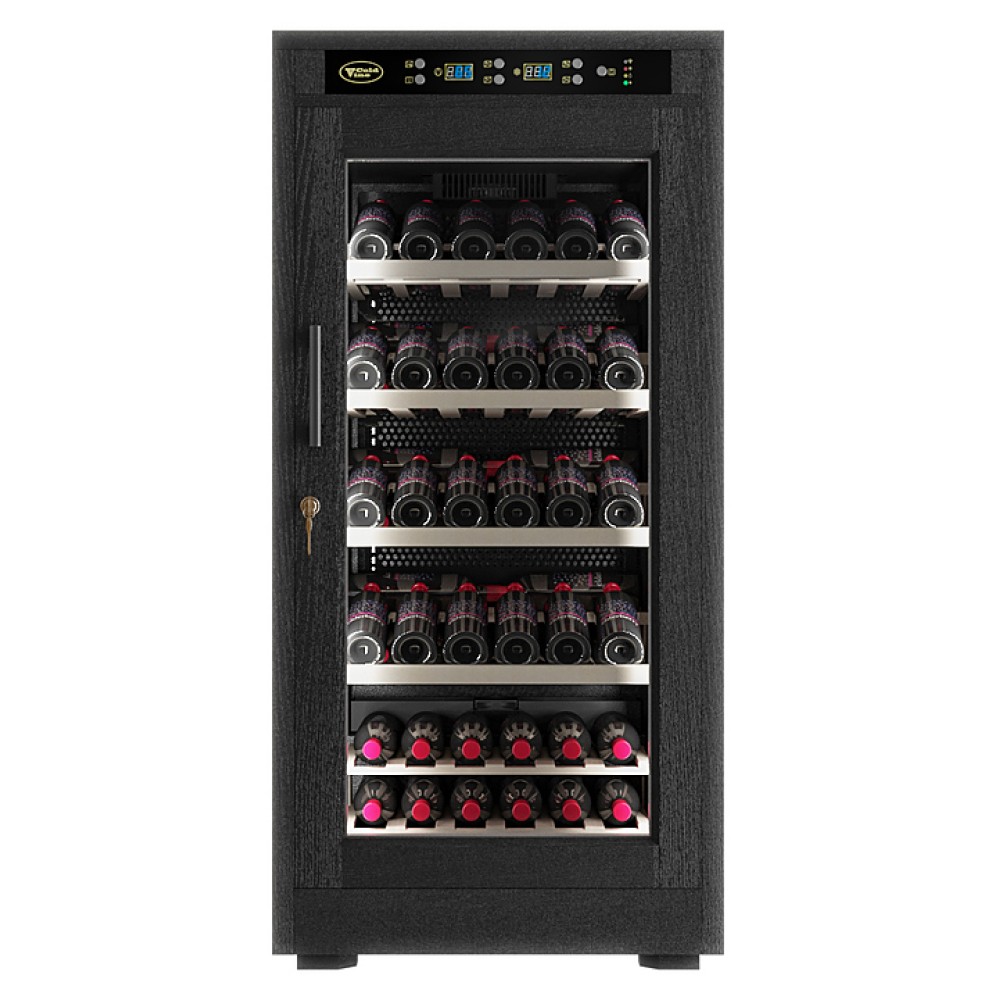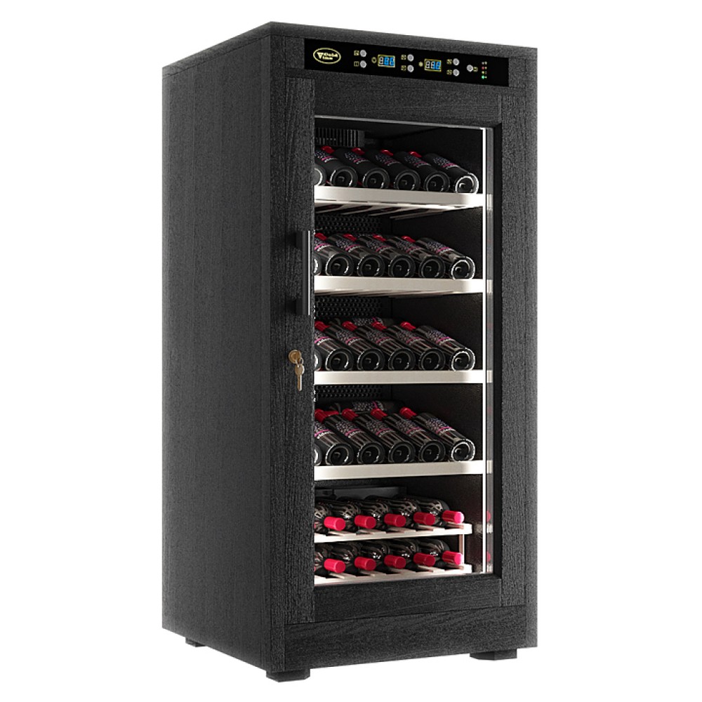 Винный шкаф Cold Vine C66-WB1 создает оптимальные условия для сохранения всех вкусовых свойств разливного вина. Модель оснащена цифровым контролем влажности, 5 деревянными полками и белой светодиодной подсветкой. Корпус классический черный и обит деревом черного цвета (шпон дуба).