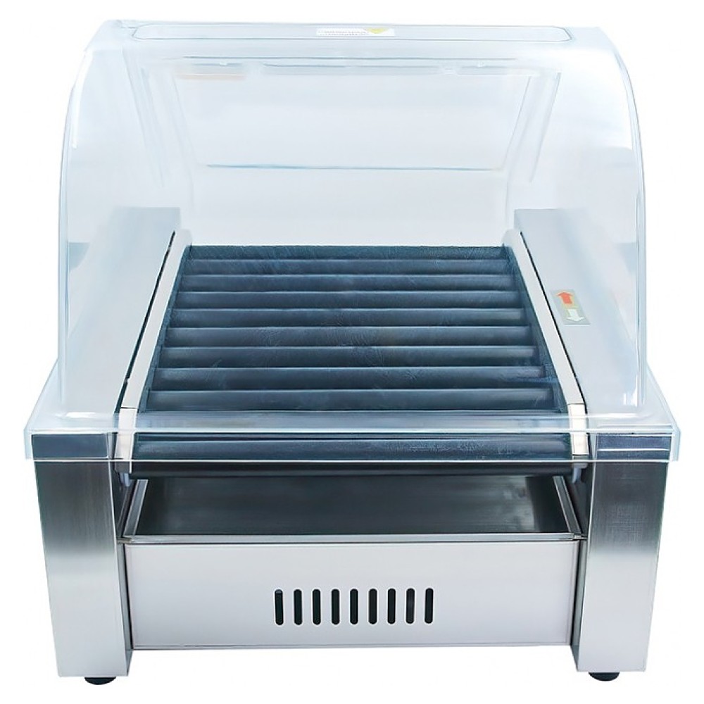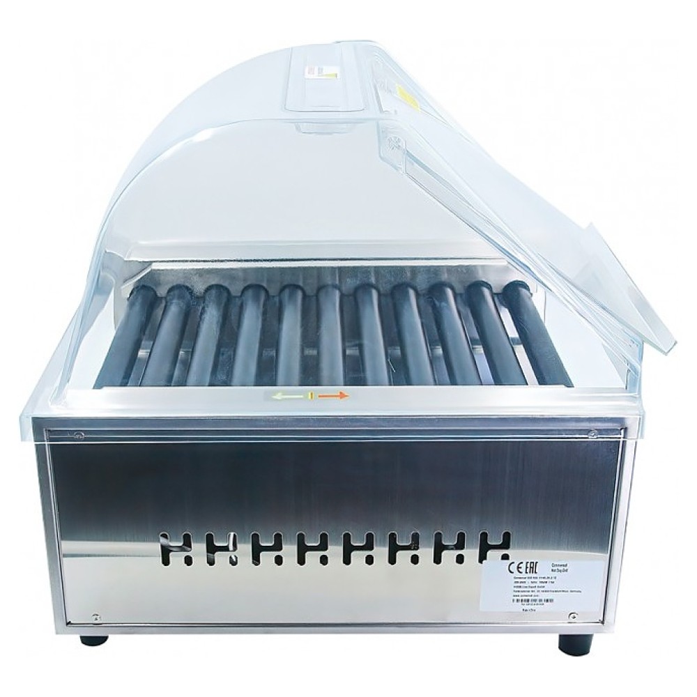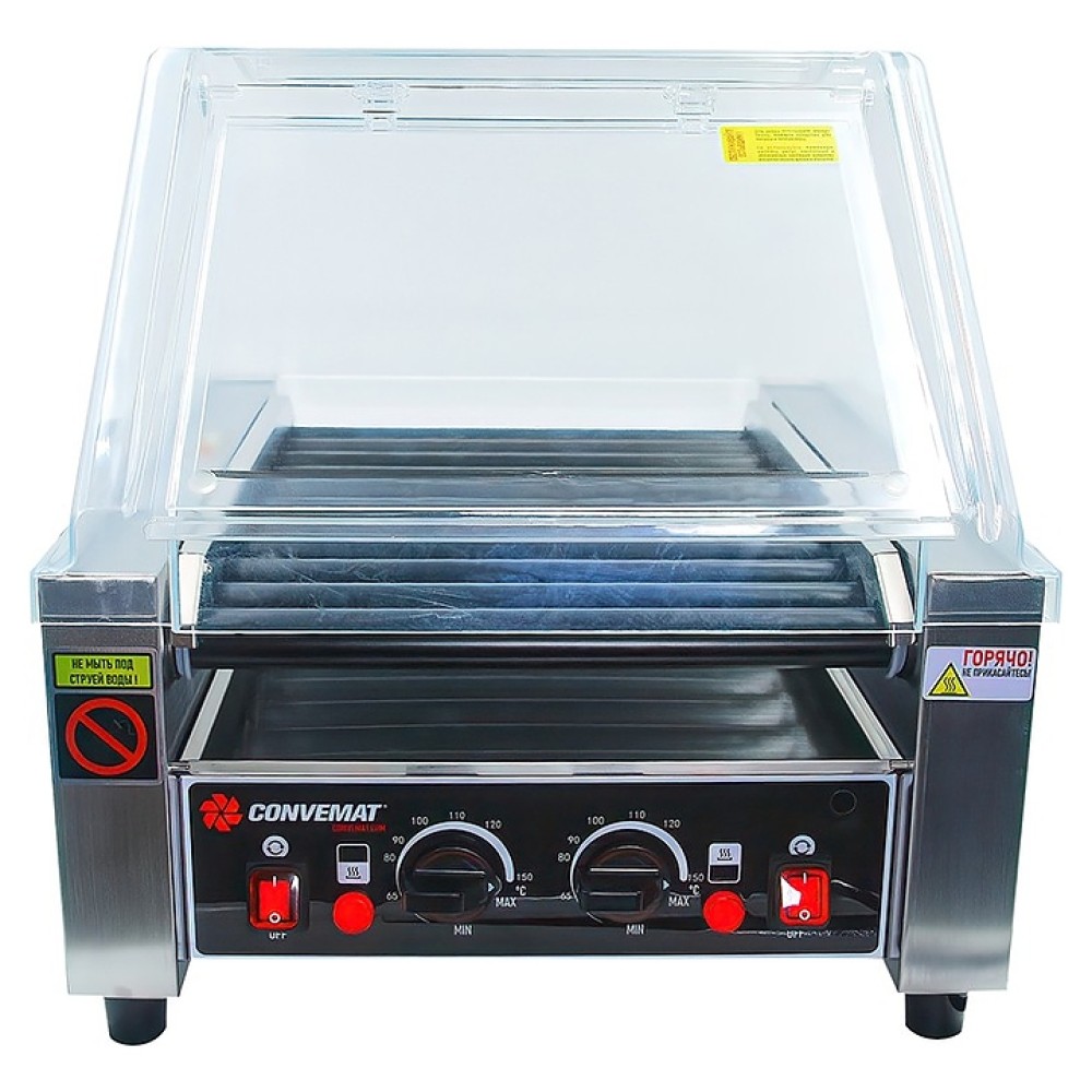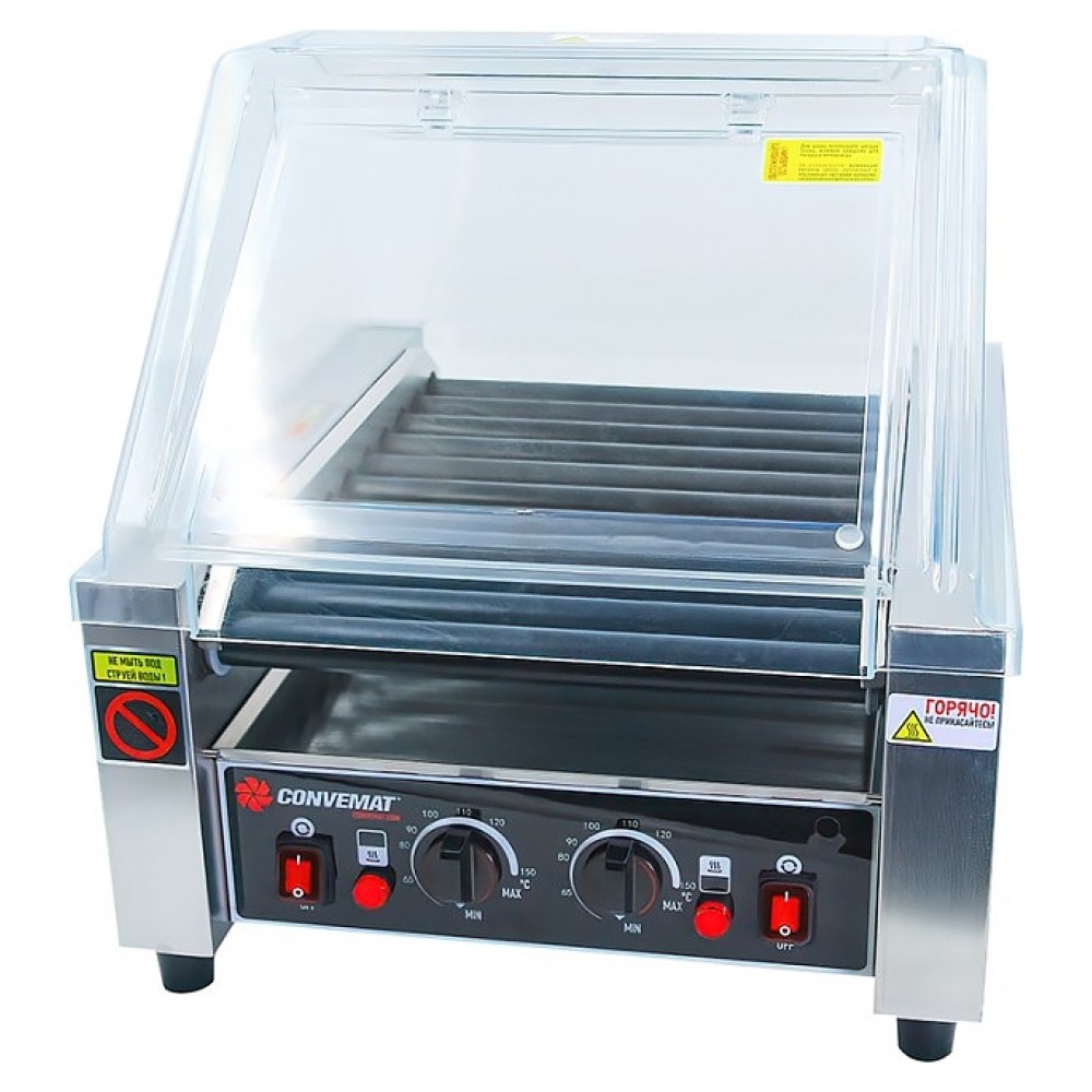 Роликовый гриль CONVEMAT 000.ROE-11/45.2S.2.TC используется для обжаривания и подогрева сосисок и колбасок для хот-догов на предприятиях общественного питания, фуд-кортах и торговых точках по продаже гриль-догов. Модель оснащена роликами с антипригарным тефлоновым покрытием, выдвигающимся лотком, защитным экраном, подсветкой рабочей площади, 2 независимыми зонами нагрева и плавной раздельной регулировкой температуры. Магнитные боковые ограничители защищают от стекания жира по внутренним бортам. Легкий наклон рабочей поверхности в сторону покупателя обеспечивают лучшую презентацию и обзор продукта. Корпус и ТЭНы выполнены из нержавеющей стали, экран - из акрила.