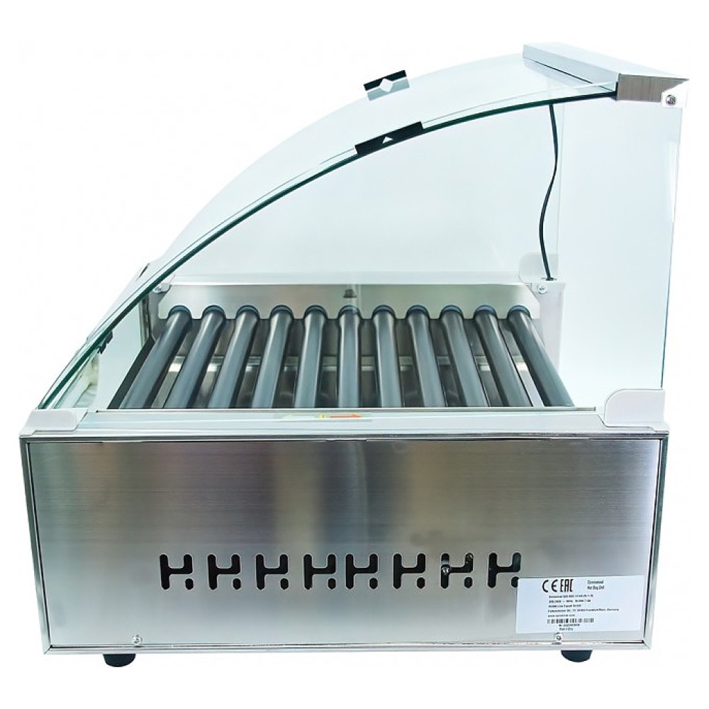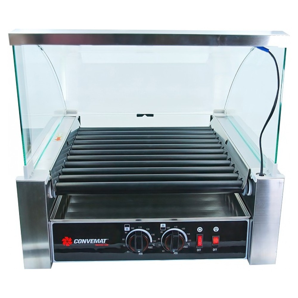 Роликовый гриль CONVEMAT 000.ROE-11/49.2S.1.TC используется для обжаривания и подогрева сосисок и колбасок для хот-догов на предприятиях общественного питания, фуд-кортах и торговых точках по продаже гриль-догов. Модель оснащена роликами с антипригарным тефлоновым покрытием, выдвигающимся лотком, защитным экраном, подсветкой рабочей площади, 2 независимыми зонами нагрева и плавной регулировкой температуры. Боковые ограничители с механической фиксацией защищают от стекания жира по внутренним бортам. Легкий наклон рабочей поверхности в сторону покупателя обеспечивают лучшую презентацию и обзор продукта. Корпус выполнен из нержавеющей стали, экран - из стекла.