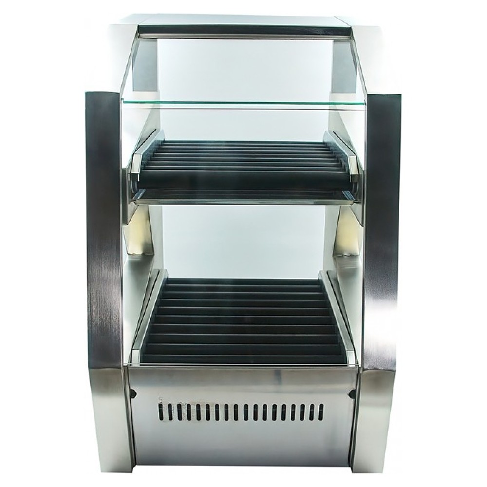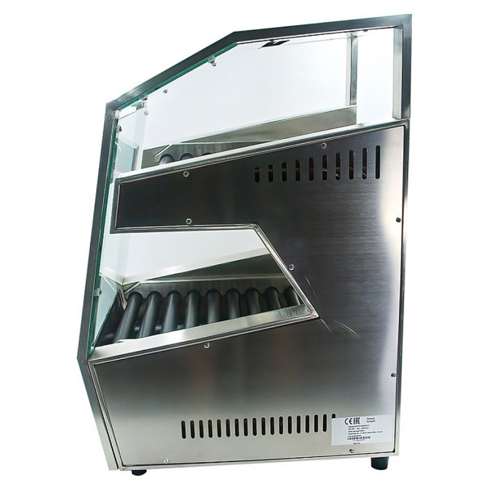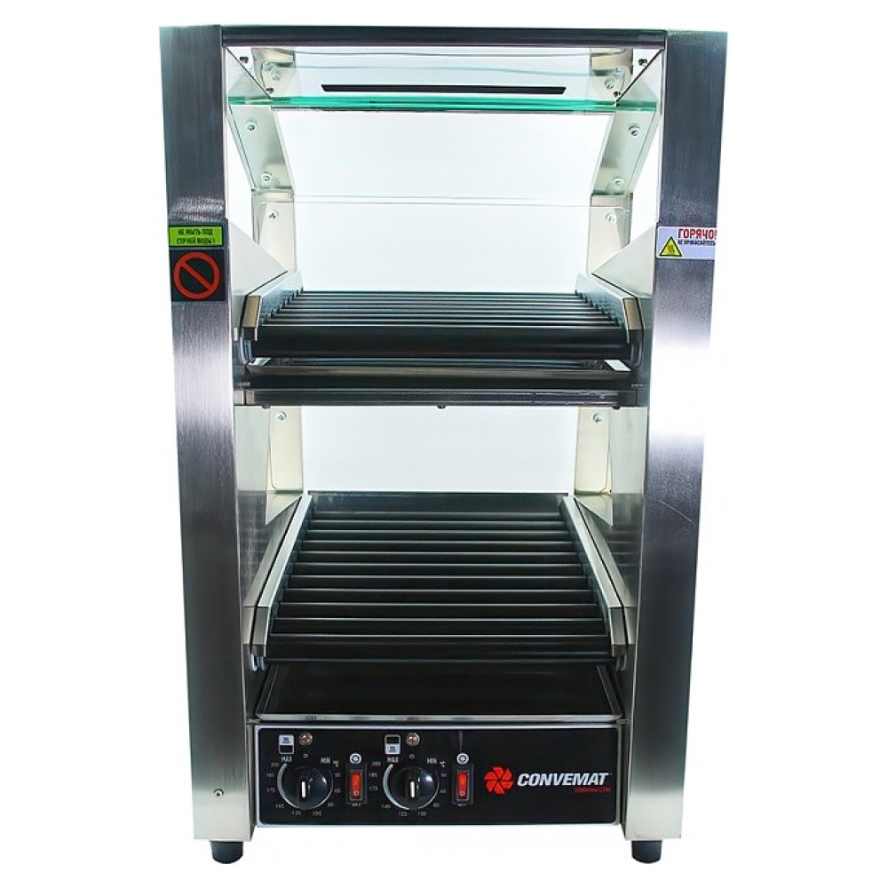 Роликовый гриль CONVEMAT 000.ROE-20/44.2S.2.TC используется для обжаривания и подогрева сосисок и колбасок для хот-догов на предприятиях общественного питания, фуд-кортах и торговых точках по продаже гриль-догов. Модель оснащена роликами с антипригарным тефлоновым покрытием, выдвигающимся лотком, защитным экраном, подсветкой рабочей площади, 2 независимыми зонами нагрева и плавной раздельной регулировкой температуры. Магнитные боковые ограничители защищают от стекания жира по внутренним бортам. Легкий наклон рабочей поверхности в сторону покупателя обеспечивают лучшую презентацию и обзор продукта. Корпус, ТЭНы и боковые ограничители выполнены из нержавеющей стали, экран - из стекла.