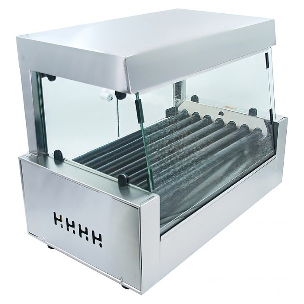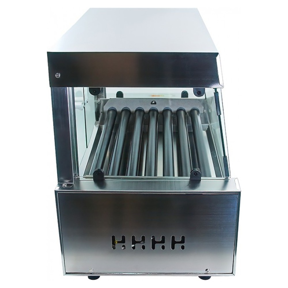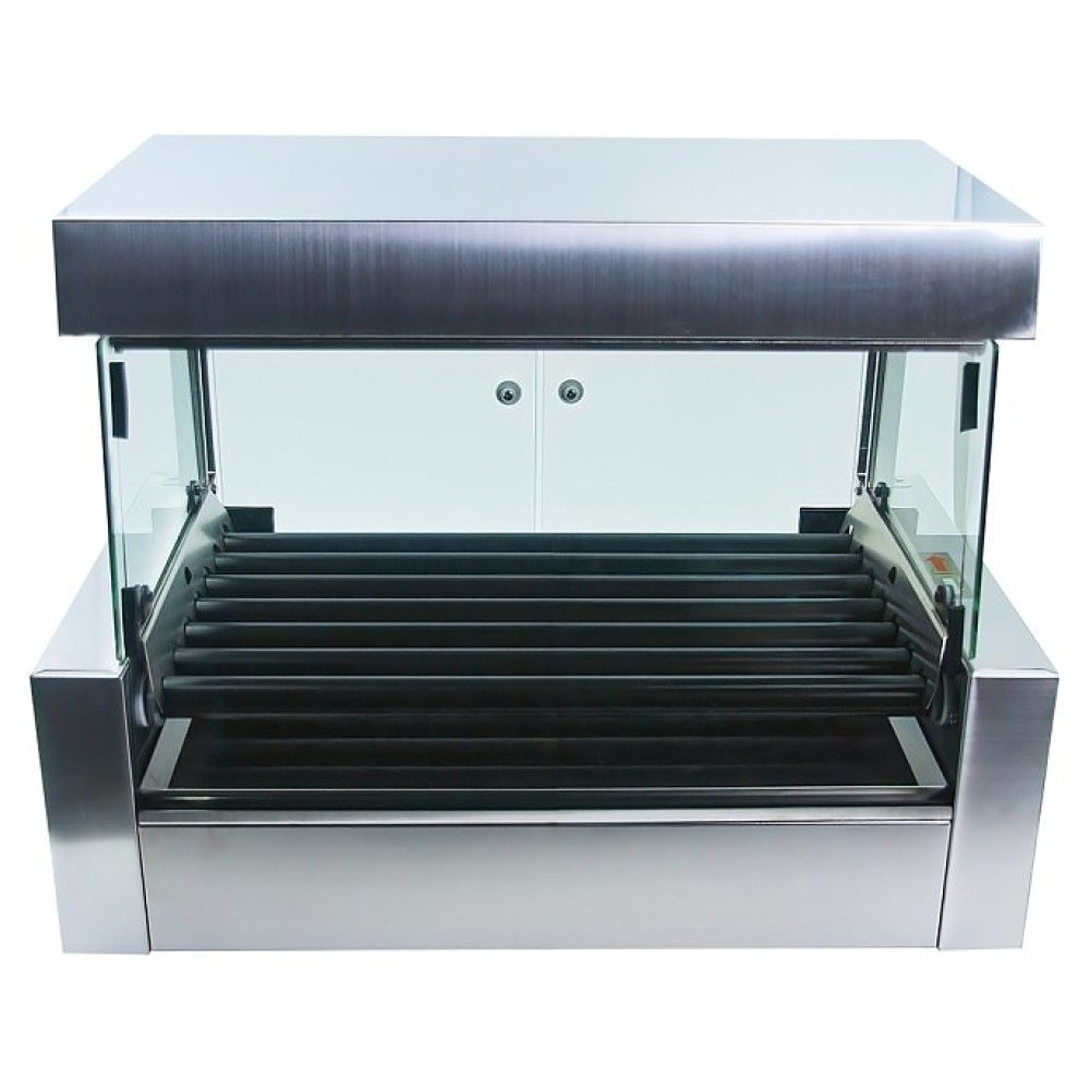 Роликовый гриль CONVEMAT 000.ROE-7/58.2S.1.TC используется для обжаривания и подогрева сосисок и колбасок для хот-догов на предприятиях общественного питания, фуд-кортах и торговых точках по продаже гриль-догов. Модель оснащена роликами с антипригарным тефлоновым покрытием, выдвигающимся лотком, защитным экраном, подсветкой рабочей площади, 2 независимыми зонами нагрева и плавной регулировкой температуры. Боковые ограничители с механической фиксацией защищают от стекания жира по внутренним бортам. Легкий наклон рабочей поверхности в сторону покупателя обеспечивают лучшую презентацию и обзор продукта. Корпус выполнен из нержавеющей стали, экран - из стекла.
