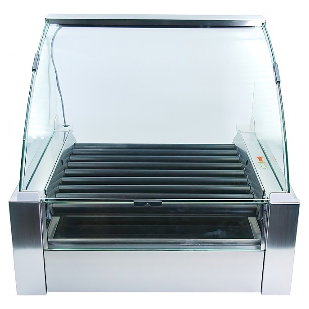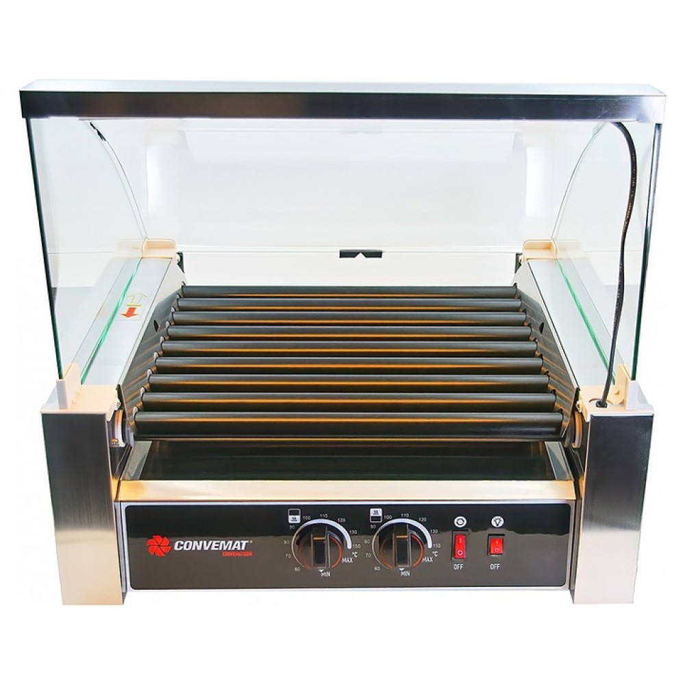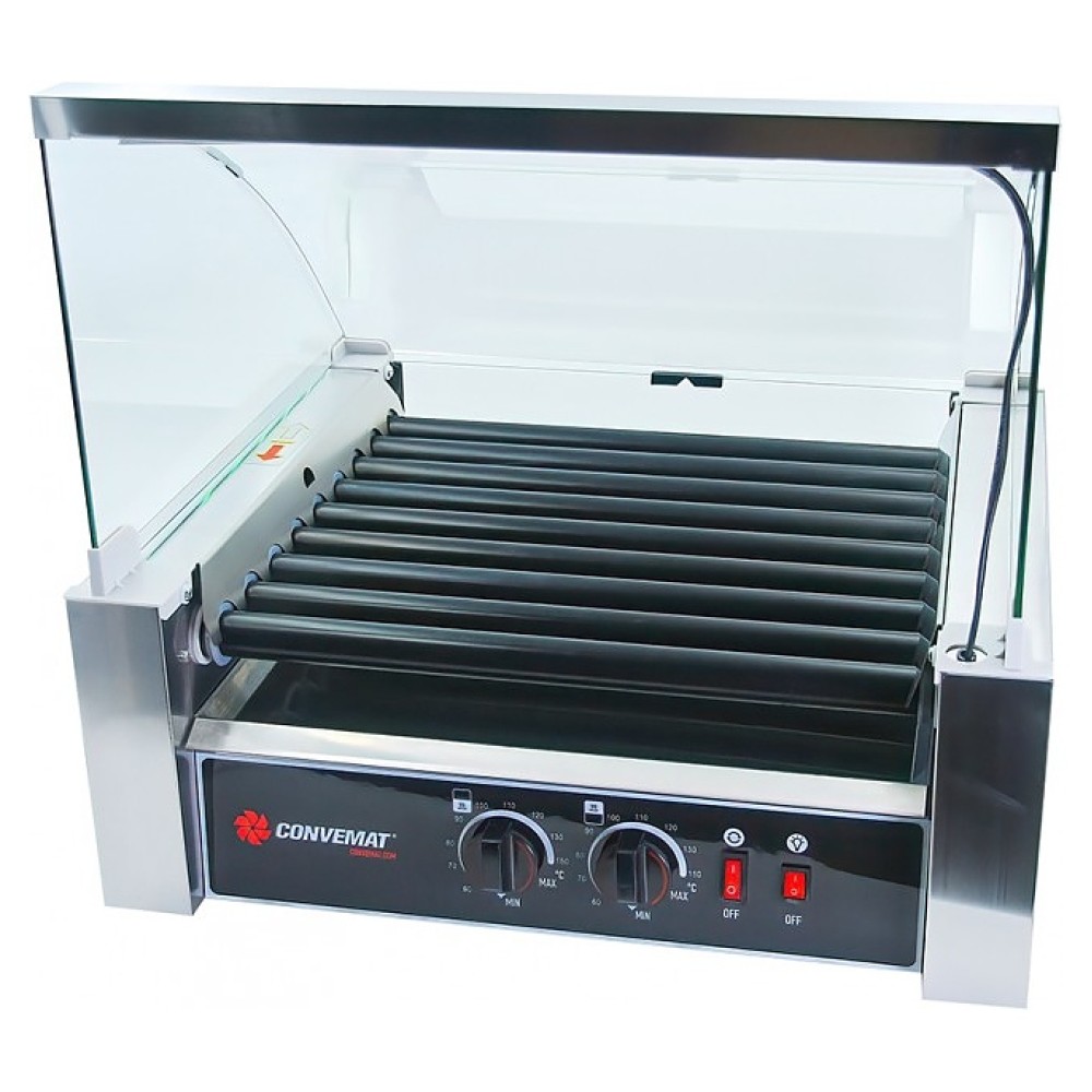 Роликовый гриль CONVEMAT 000.ROE-9/49.2S.1.TC используется для обжаривания и подогрева сосисок и колбасок для хот-догов на предприятиях общественного питания, фуд-кортах и торговых точках по продаже гриль-догов. Модель оснащена роликами с антипригарным тефлоновым покрытием, выдвигающимся лотком, защитным экраном, подсветкой рабочей площади, 2 независимыми зонами нагрева и плавной регулировкой температуры. Боковые ограничители с механической фиксацией защищают от стекания жира по внутренним бортам. Легкий наклон рабочей поверхности в сторону покупателя обеспечивают лучшую презентацию и обзор продукта. Корпус выполнен из нержавеющей стали, экран - из стекла.