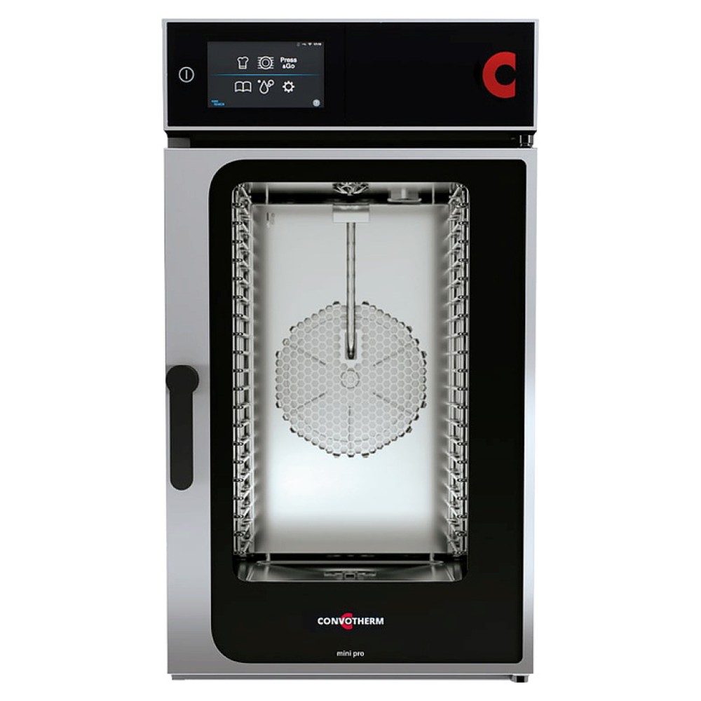 Пароконвектомат Convotherm Mini pro 10.10 предназначен для обжаривания, приготовления на пару, бланширования, запекания и других видов тепловой обработки продуктов на предприятиях общественного питания. Модель оснащена 7" сенсорным TFT-дисплеем с функцией прокрутки, внутренней LED-подсветкой, многоточечным термощупом и дверцей с тройным остеклением (петли слева). Камера выполнена из нержавеющей стали, рама дверцы - из нержавеющей стали.