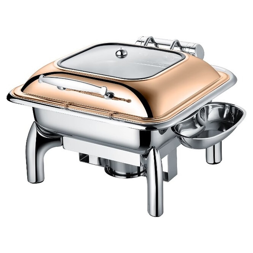 Чафинг-диш Crazy Pan CP-CHD017RG предназначен для постоянного подогрева первых и вторых блюд и поддержания их оптимальной температуры на предприятиях общественного питания и торговли. Модель оснащена откидной крышкой с ручкой. Корпус выполнен из высококачественной нержавеющей стали марки 201 с глянцевой серебристой поверхностью, крышка с глянцевым покрытием оттенка розовое золото.