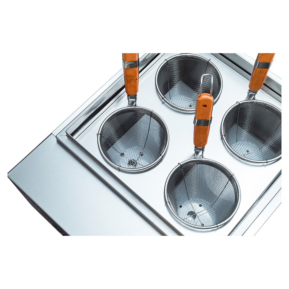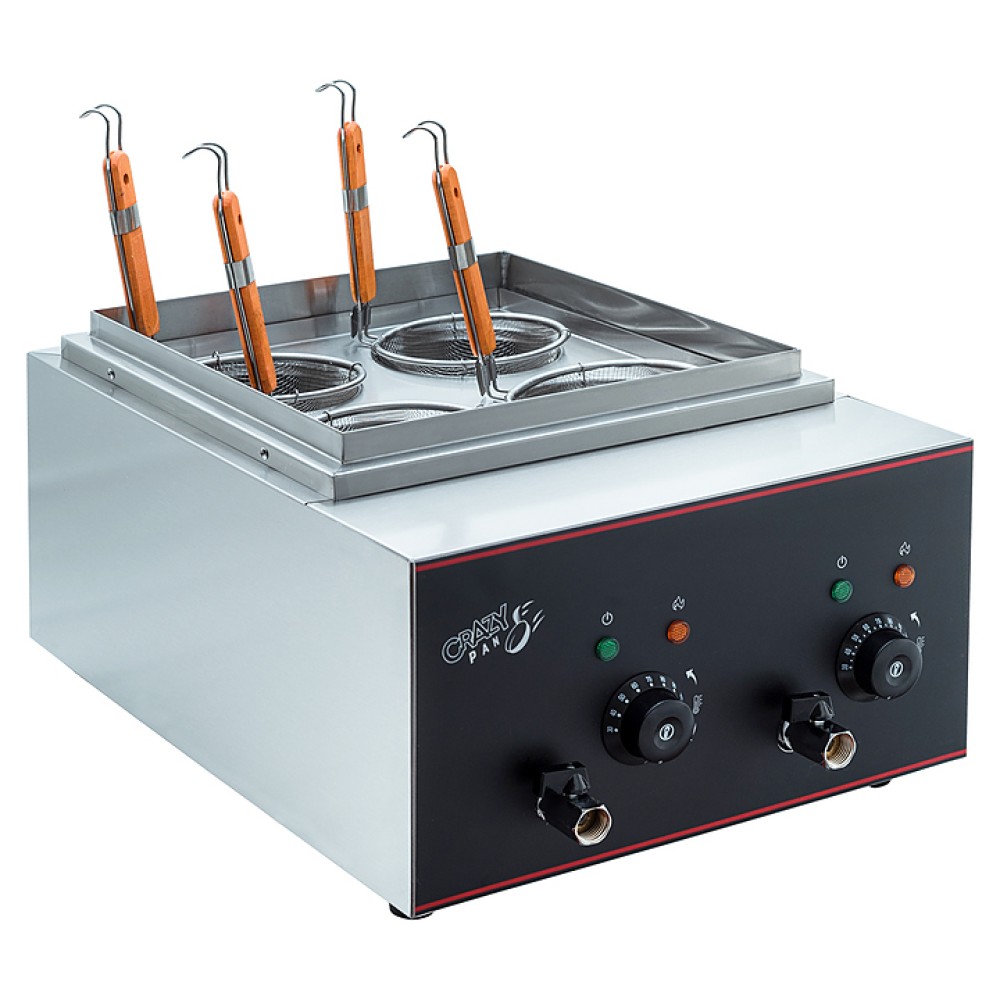 Макароноварка Crazy Pan CP-NC40 предназначена для приготовления различных продуктов в большом количестве воды на предприятиях общественного питания и торговли. Модель оснащена 2 группами нагрева, 2 терморегуляторами, 2 ТЭНами, 4 корзинами для варки пасты. Корпус выполнен из нержавеющей стали.