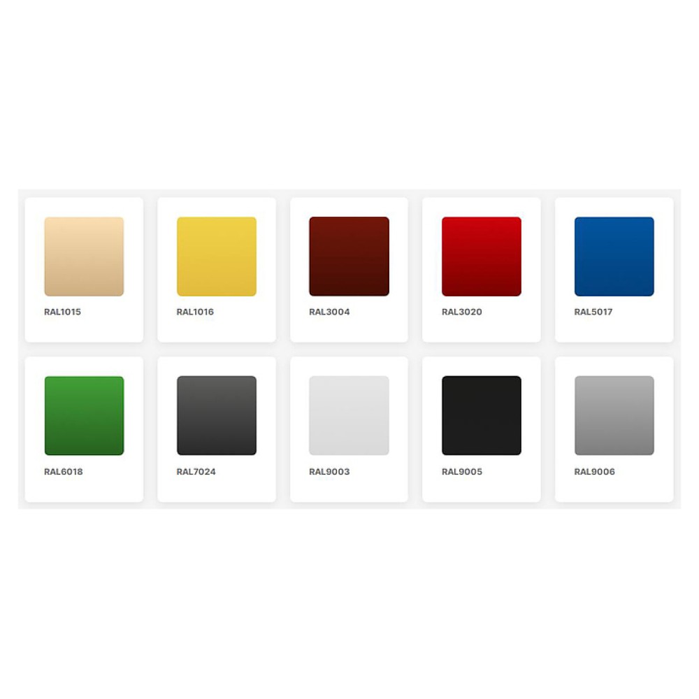 Модель доступна в 10 стандартных цветовых исполнениях фронтальной панели по таблице RAL: 9003, 9006, 9005, 3004, 7024, 1016, 6018, 3020, 5017 и 1015.