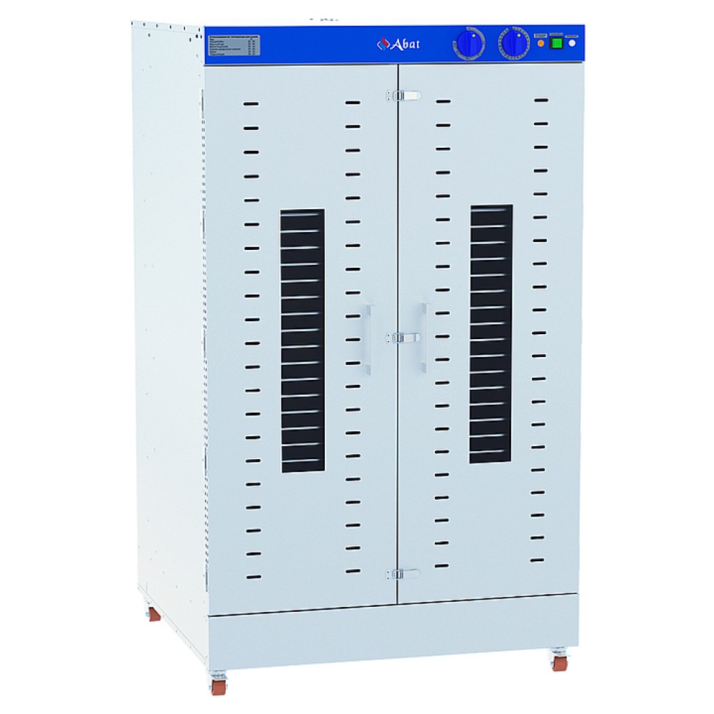 Дегидратор Abat ШС-32-2Г предназначен для сушки трав, фруктов, овощей, ягод, макаронных изделий, мясных продуктов, приготовления пастилы и йогурта на предприятиях общественного питания и торговли. Модель оснащена 2 дверями, 8 вентиляторами, 4 направляющими для емкостей, ТЭН-ами различной мощности, аварийным термостатом, механическим таймером времени с функцией отключения и колесами с функцией стопорения. Каркас выполнен из окрашенной стали.