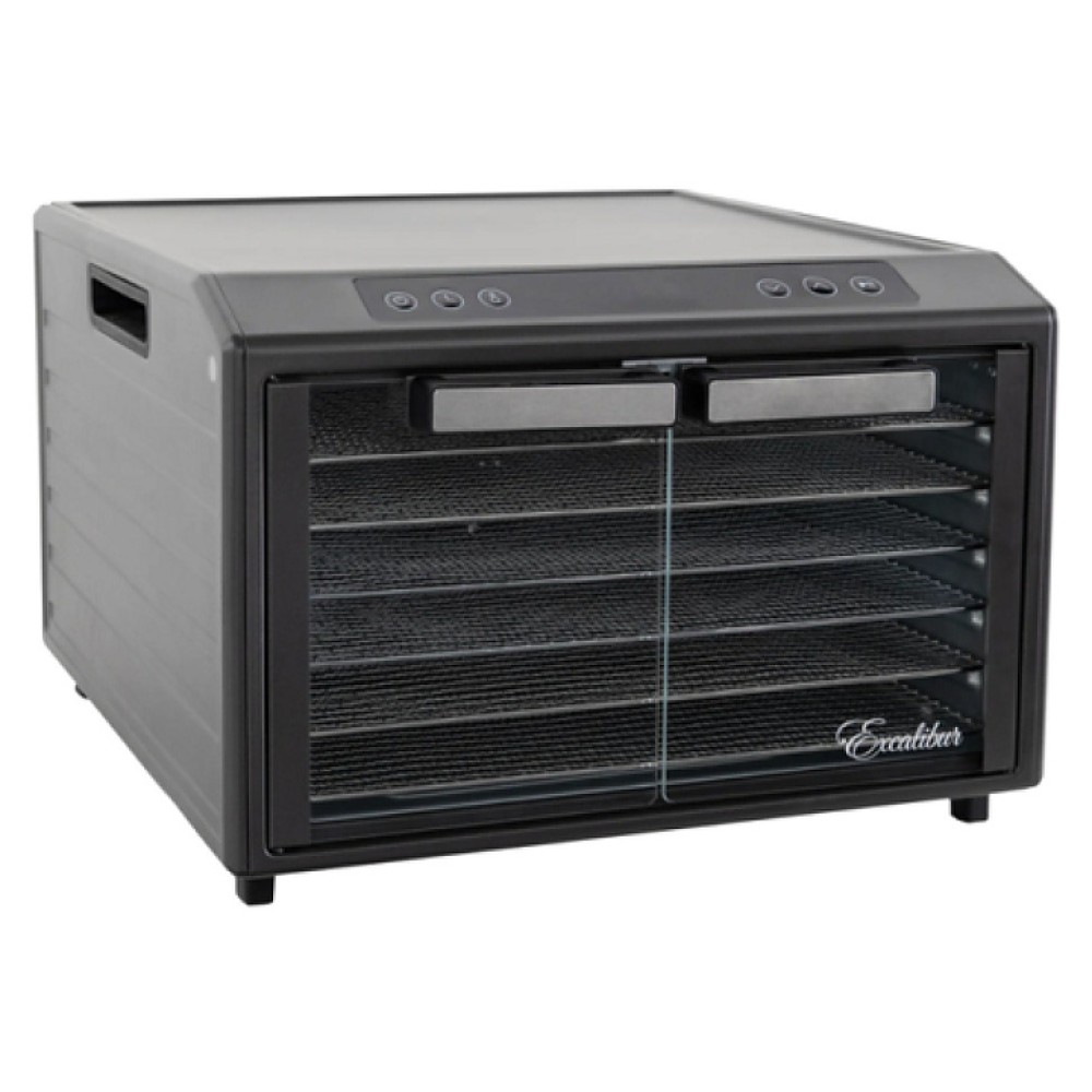 Дегидратор Excalibur 6 Tray Select предназначен для сушки овощей, фруктов, ягод, орехов, грибов и трав, расстойки теста, приготовления йогурта, вяления мяса и рыбы на предприятиях общественного питания и в домашних условиях. Модель оснащена светодиодной панелью управления. Корпус выполнен из нержавеющей стали, дверца - из стекла.